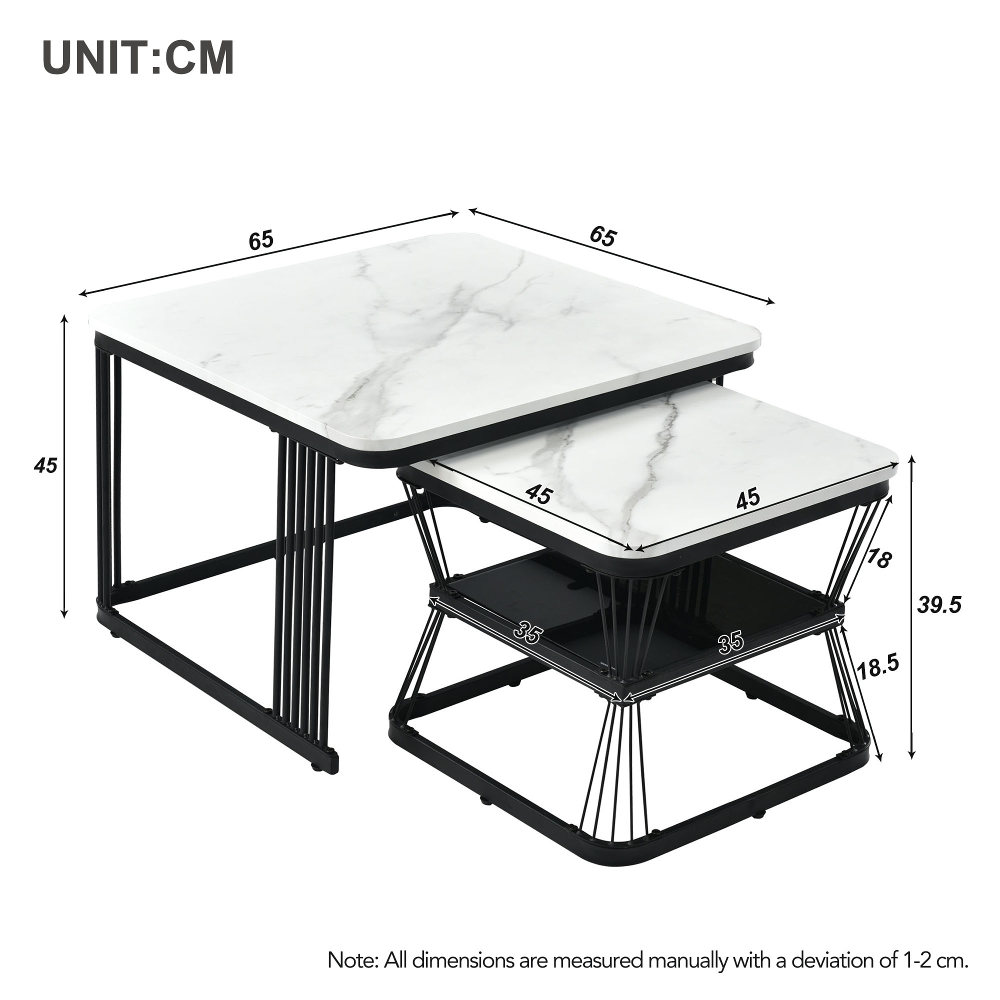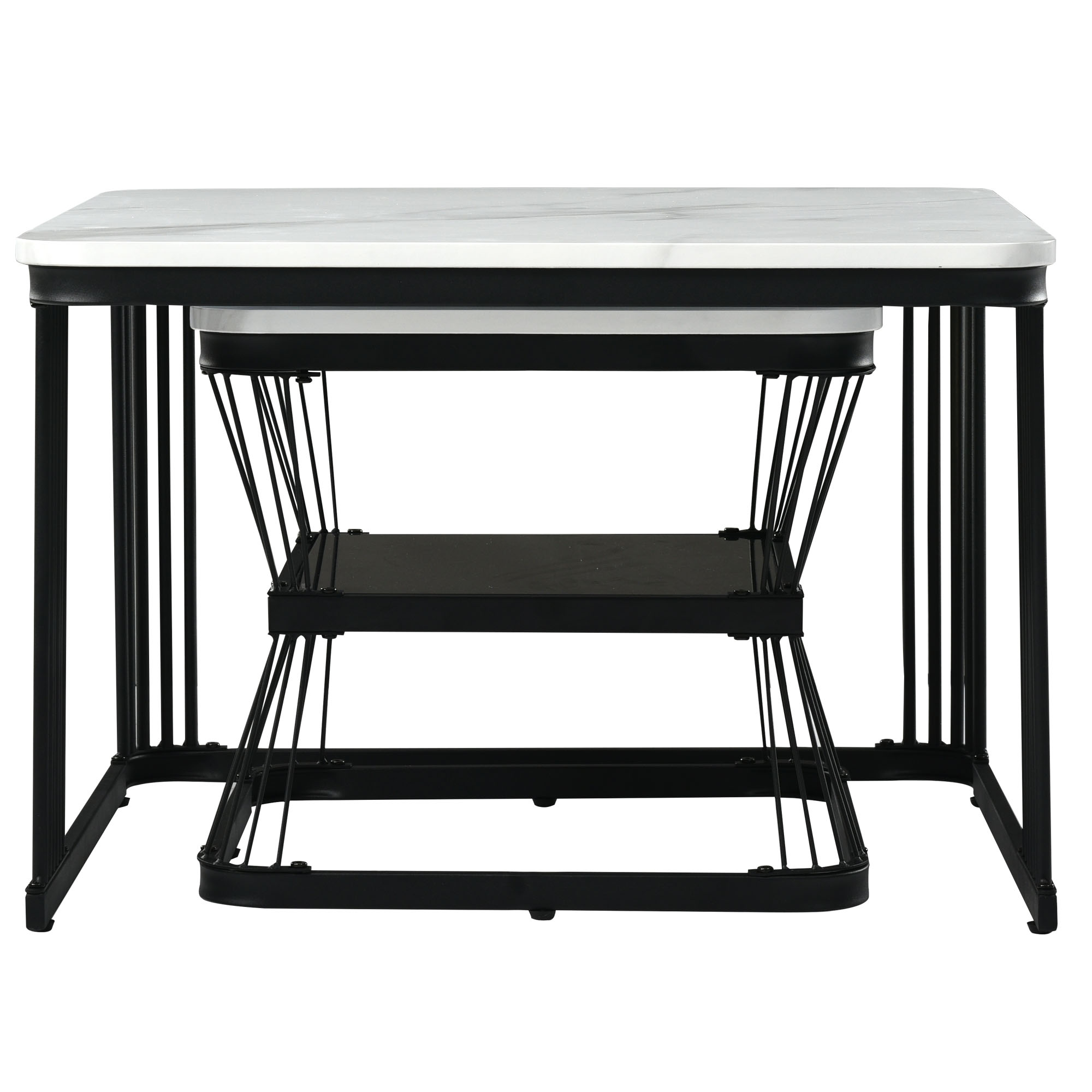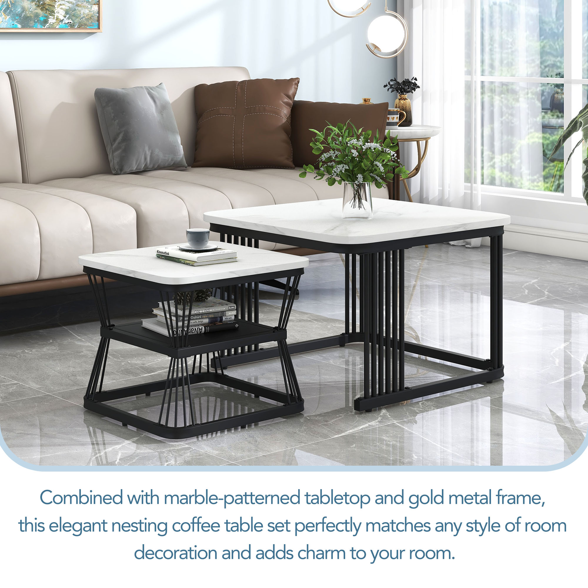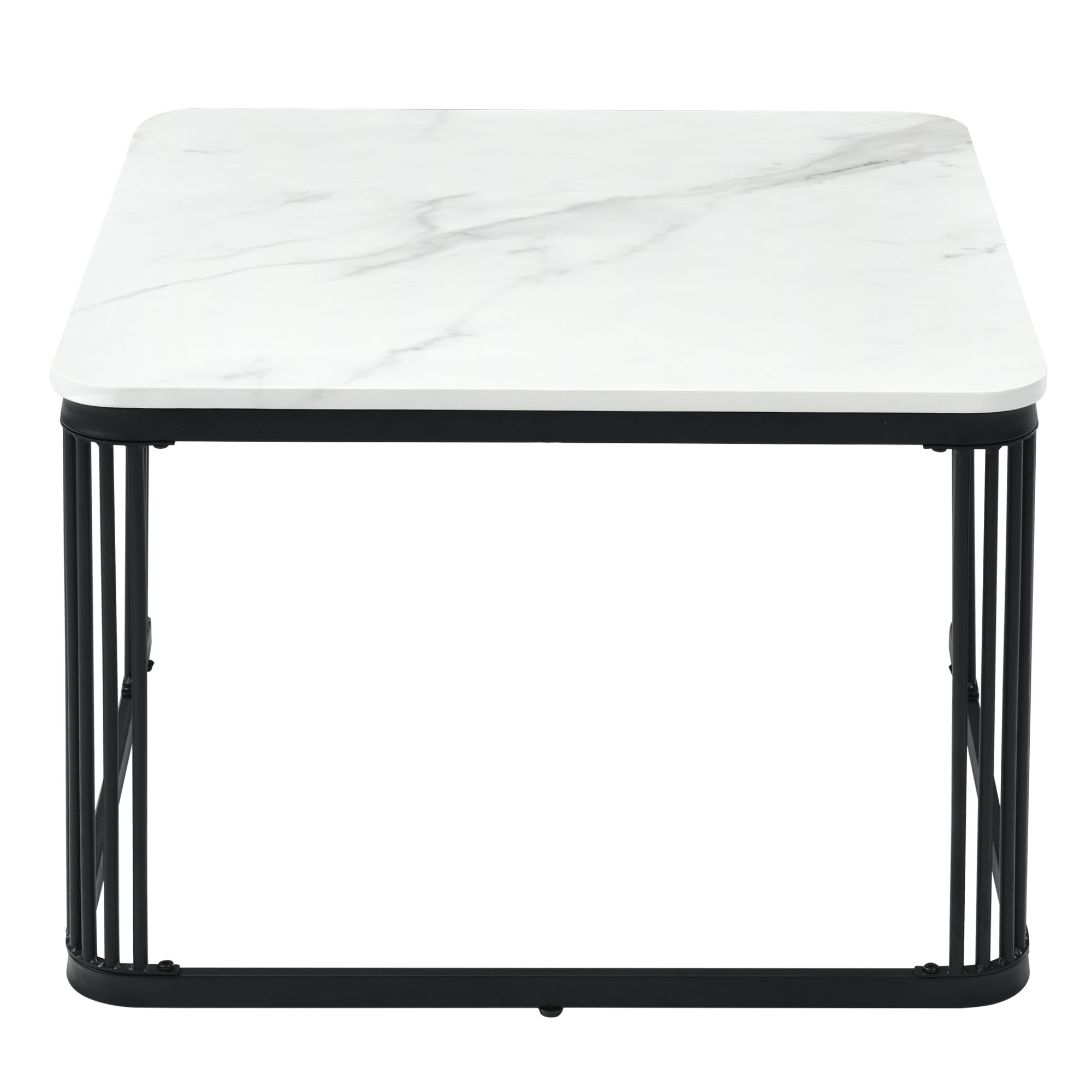 Product Name:Nest of 2 Tables Square Coffee Table Coffee Table Set Nesting Sofa Table Multi-functional End Side Table Nesting Tables with Black Metal Frame Legs and Marble Pattern White Top for Living Room Home