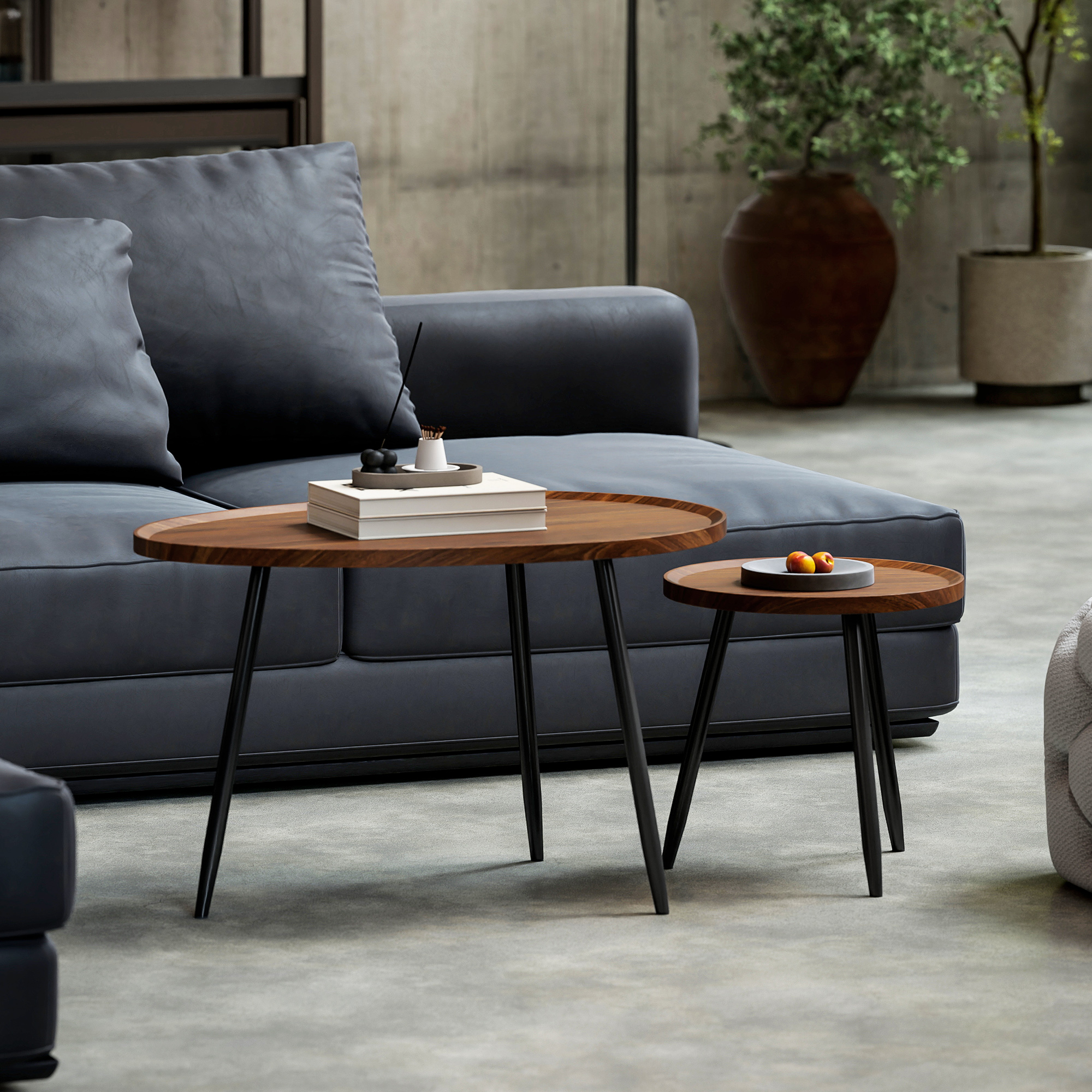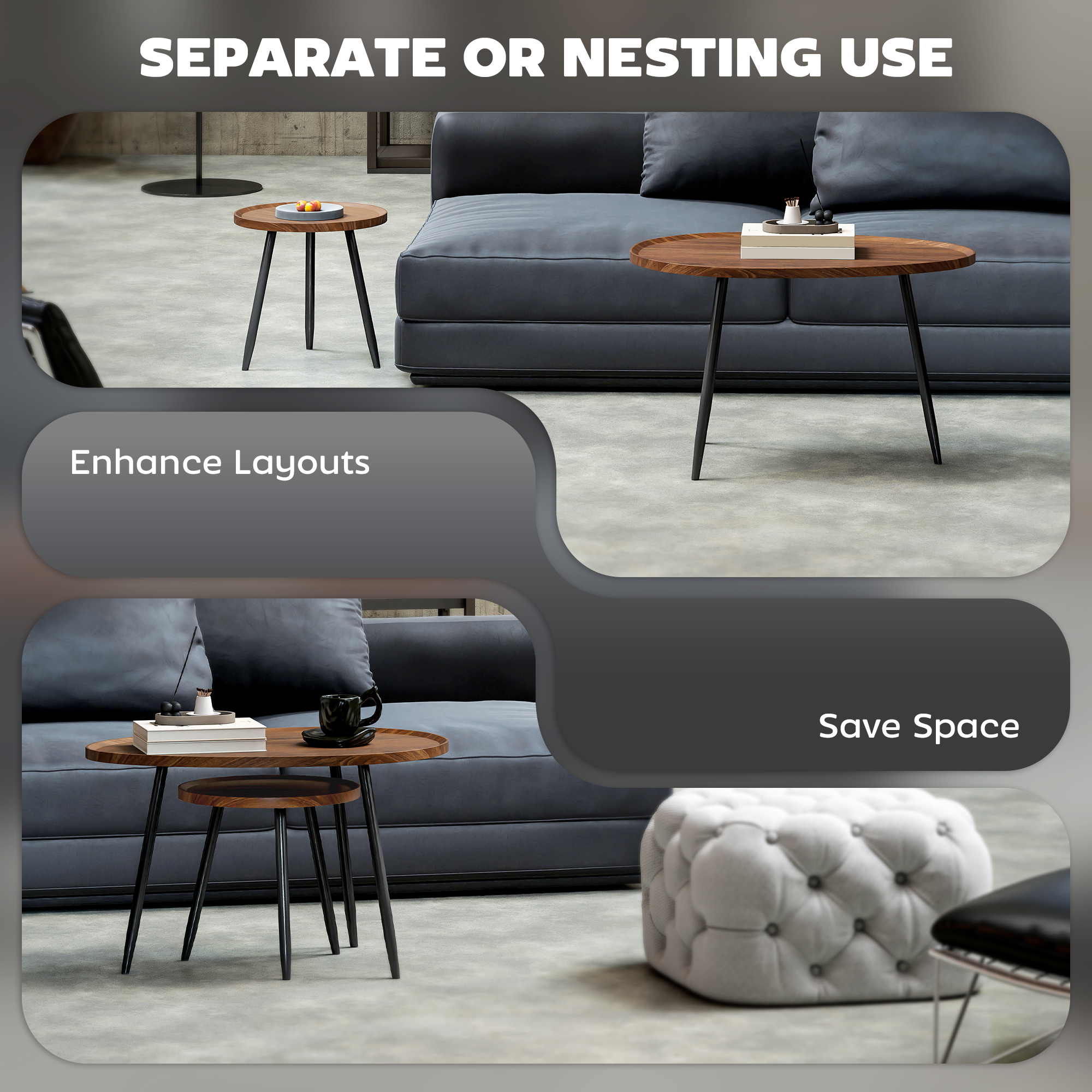 Discover the versatile charm of the nest of tables, a compact two-piece set designed to adapt to your space and needs. Use them together or separately as chic side tables. Featuring wood-effect tops and sleek matte black metal bases, they blend everyday functionality with a modern touch, great for displaying your favourite decor or keeping essentials close by.