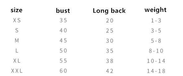 Size: XS (weight 1-3 kg) s (weight 3-5 kg) m (weight 5-8 kg) l (weight 8-11 kg) XL (weight 11-13 kg) XXL (weight 13-15 kg)