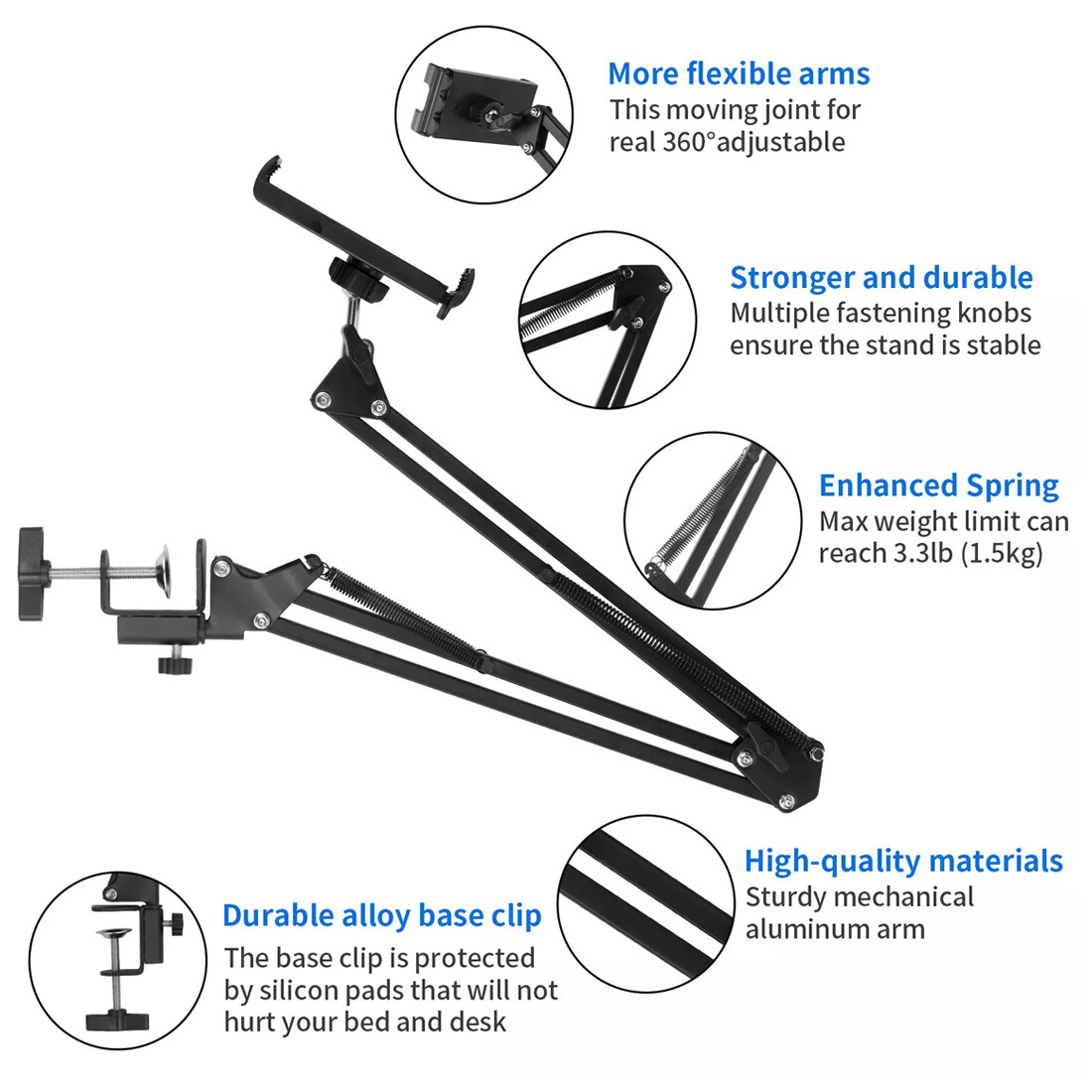 360 TOTALLY ADJUSTABLE - Built with multiple joints that are spring balanced, it is so easy to get your device positioned perfectly. With 360-Degree rotation, you can position your tablet or phone for total hands free use.