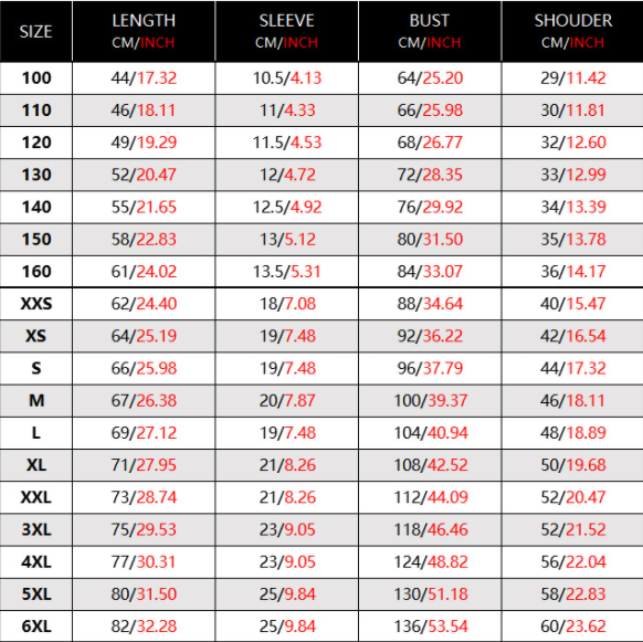 SizeXXS,XS,S,M,L,XL,XXL,XXXL,XXXXL,5XL,6XL,100,110,120,130,140,150,160