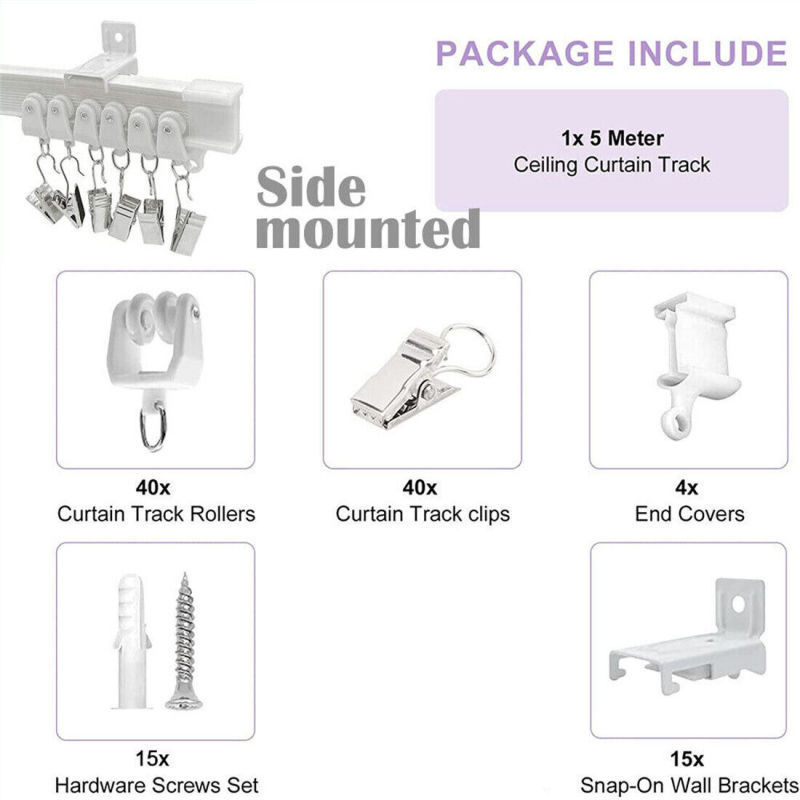 Side Mounted:You will get 1x 5m curved curtain rail, 40x curtain track clips, 40x curtain rail gliders, 4x curtain track end stop, 15x snap-on wall brackets and required screws hardware.