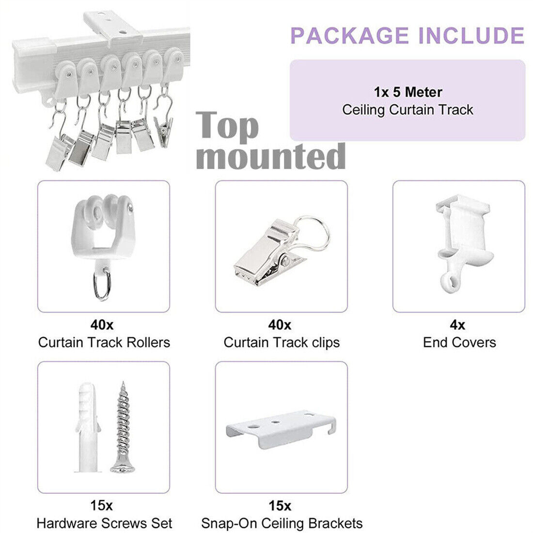 Top Mounted:You will get 1x 5m curved curtain rail, 40x curtain track clips, 40x curtain rail gliders, 4x curtain track end stop, 15x snap-on ceiling brackets and required screws hardware.