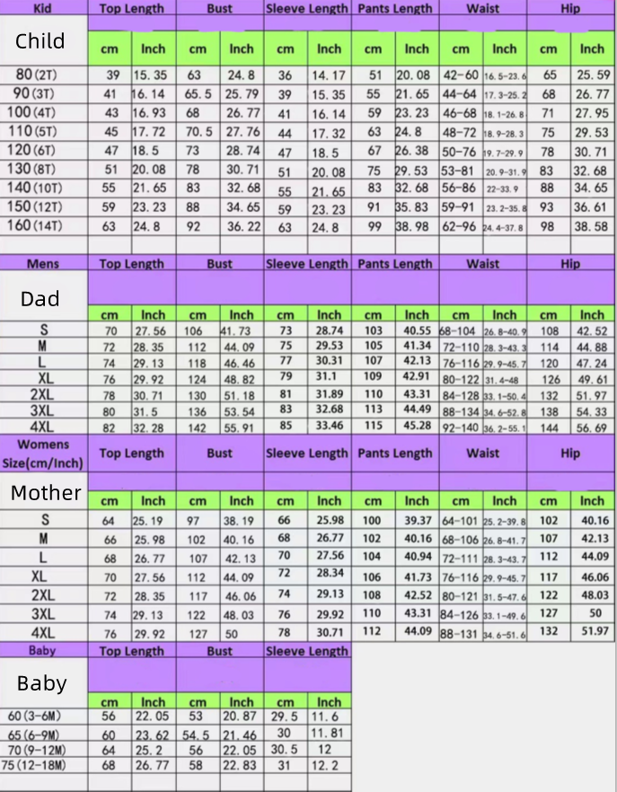 Size: Dad S, Dad M, Dad L, Dad XL, Dad 2XL, Dad 3XL, Dad 4XL, Mom S, Mom M, Mom L, Mom XL, Mom 2XL, Mom 3XL, Mom 4XL, Baby 6, Baby 9, Infant 12, Infant 18, Child 2, Child 3, Child 4, Child 5, Child 6, Child 8, Child 10, Child 12, Child 14, Dog S, Dog M, Dog L, Dog XL