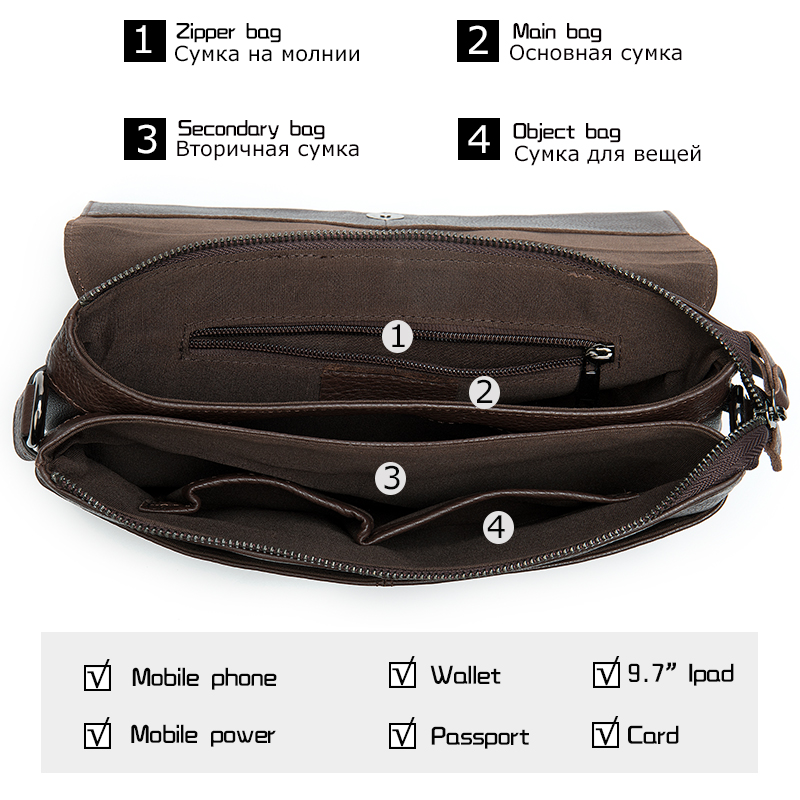 Internal structure of the bag: zipper pocket, mobile phone bag, document bag