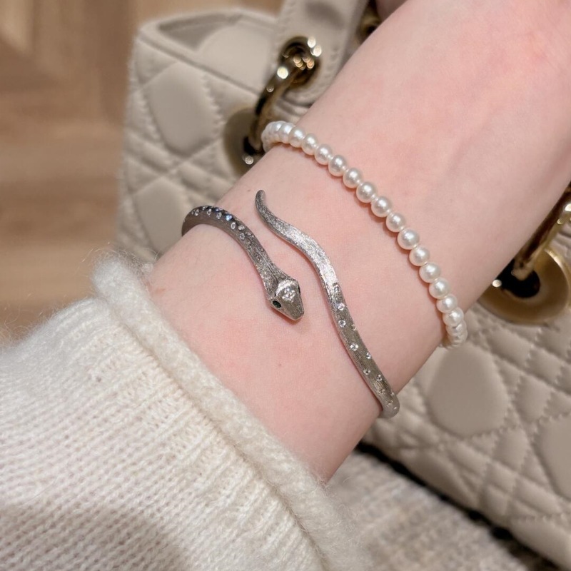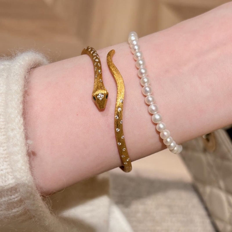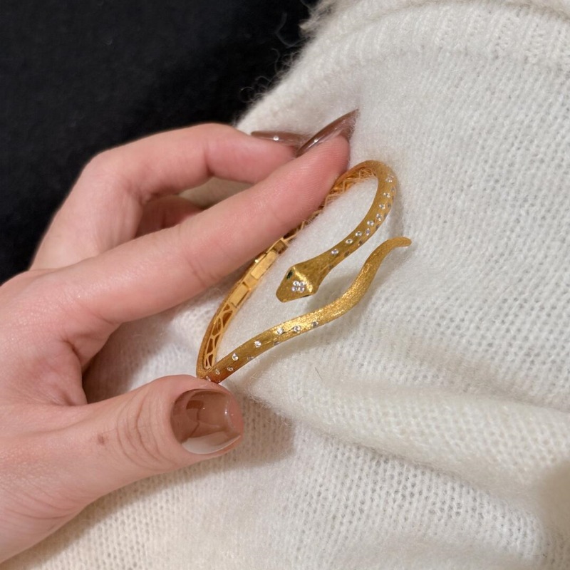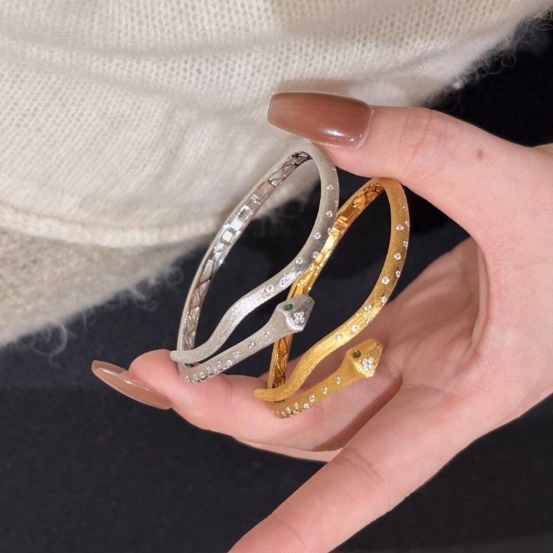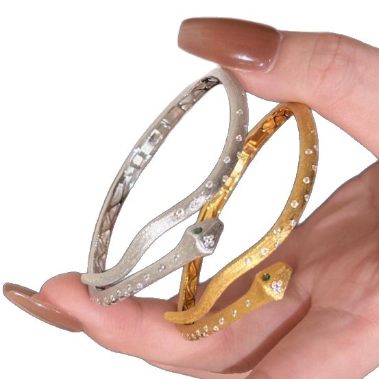 Colors: Gold brushed finish with diamond-encrusted snake bracelet, silver brushed finish with diamond-encrusted snake bracelet