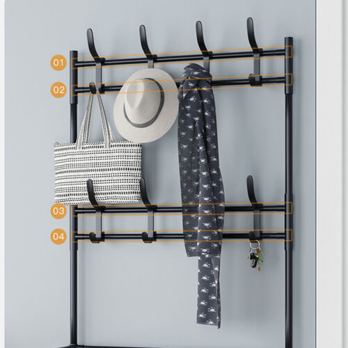 Description: 【3-IN-1 ORGANIZER】A perfect combo of shelf, coat rack and shoe storage bench; You can hang handbag, scarf, hat, umbrella, cap and more, and the bottom 4 tier storage shelf can store your shoes and storage basket; It will store many things in limited space. 【STURDY & DURABLE】: The iron metal material make this free standing garment storage shelf more durable and sturdy, ensures strong bearing capacity, not easy to deform. The surface of the powder coating prevents corrosion and rust. The surface is smooth to prevent scratching the clothes. 【8 REMOVABLE HOOKS】This hallway storage tree includes 8 solid hooks, each can load 2.2 lbs, all hooks have a rounded edges to prevent scrapes and scratches your clothes and your home. Make full use of the vertical space, you can place a variety of items. 【EASY ASSEMBLY & DISASSEMBLY】Our free standing Coat Rack Shoe Bench is simply constructed. With the help of instruction manual, you can assemble the whole unit easily. 【UNIQUE DESIGN】This classic coat rack with hooks brings a stylish touch to your entrance while creating enough storage space for daily clothing; Keep your daily outfits well organized, great for living room, bedroom, office, apartment, hotel, hallway, entryway.
