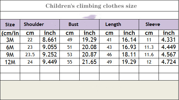 Size: S, M, L, XL, XXL, XXXL, climbing suit 3M, climbing suit 6M, climbing suit 9M, climbing suit 12M