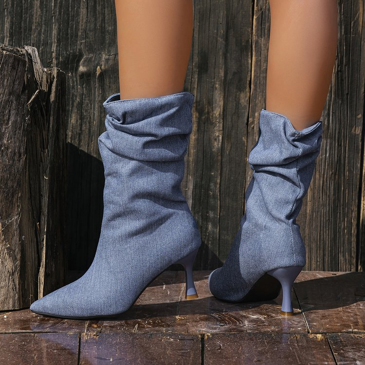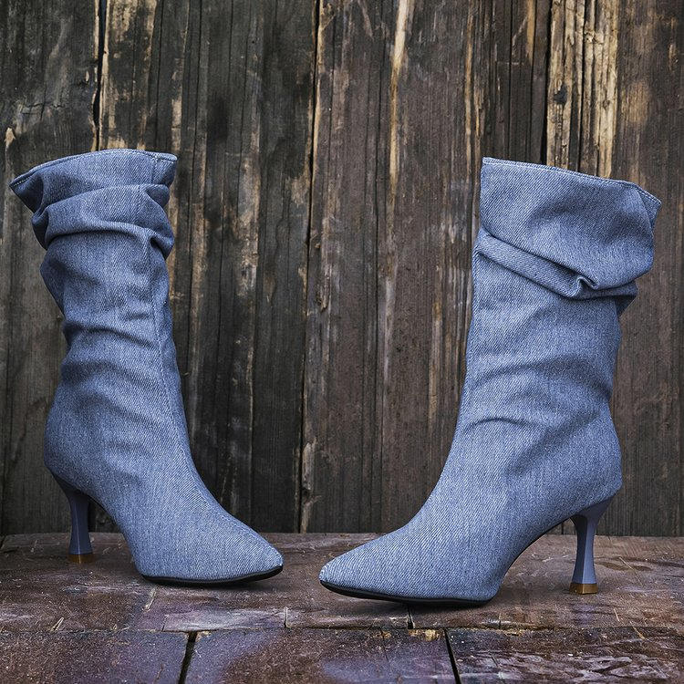 Elevate your everyday look with these chic French retro pleated denim stiletto mid-calf boots. Featuring a sleek pointed toe, a slouchy ruched design, and a slender stiletto heel, these mid-calf boots offer effortless style and a flattering leg-lengthening effect. Perfect for adding a touch of timeless elegance to fall/winter outfits, office wear, or casual daily use.