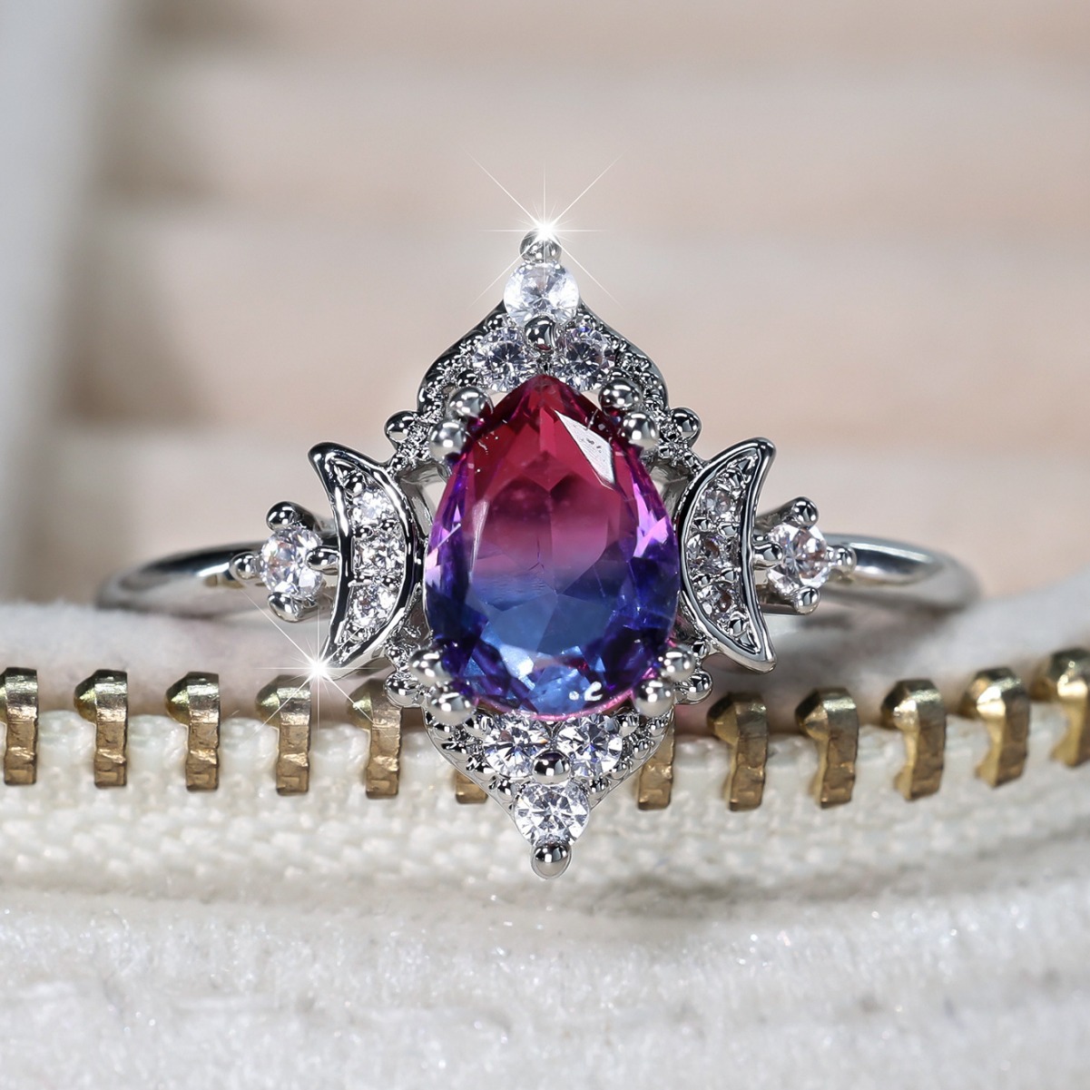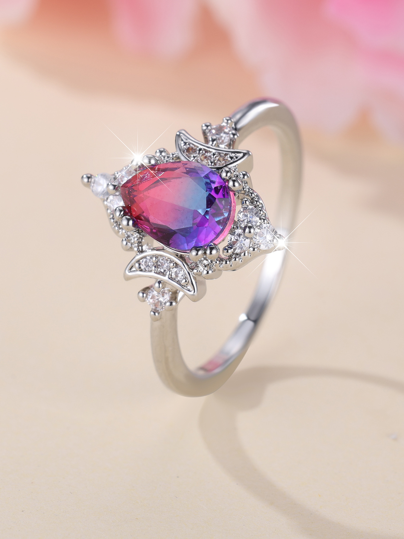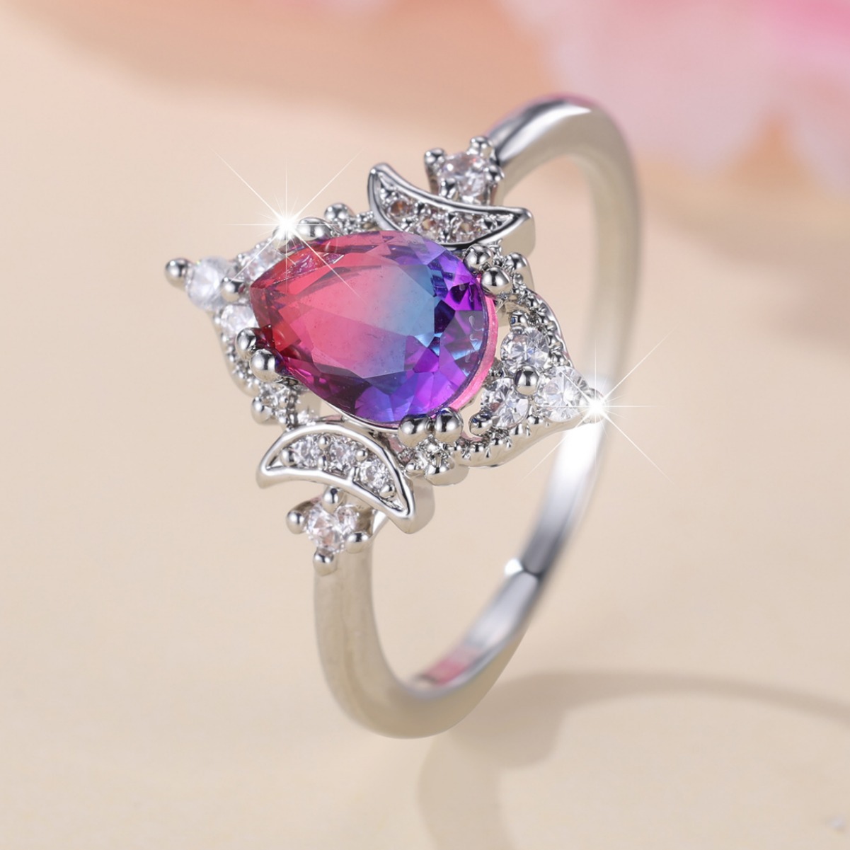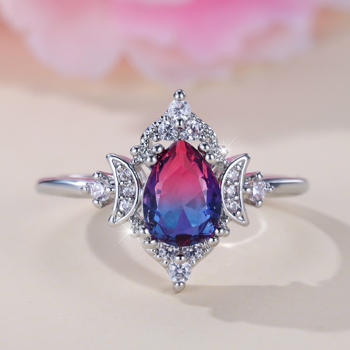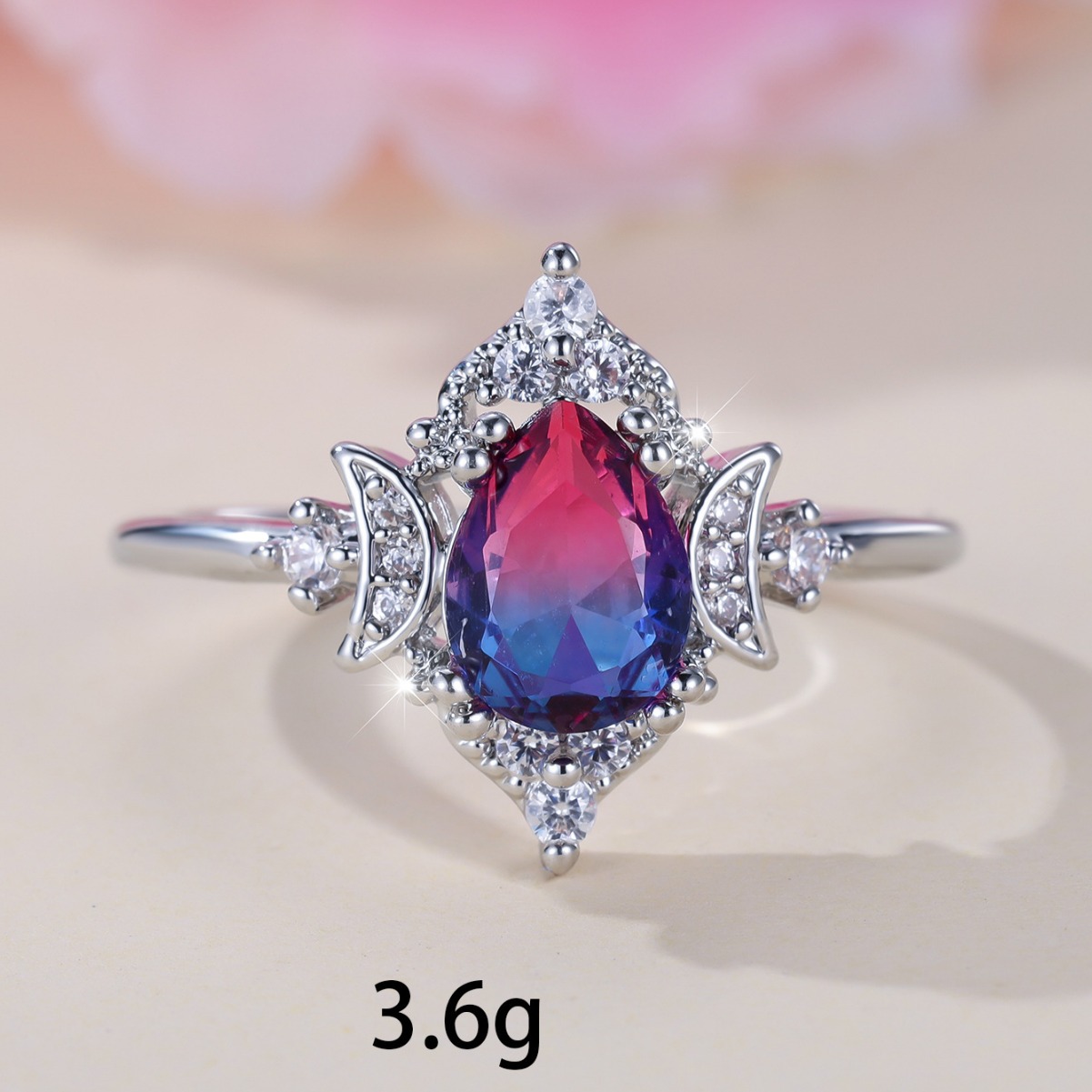 New Gradient White K Rose Blue Water Drop Tourmaline Crown Ring Personality Fashion