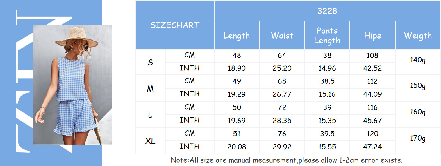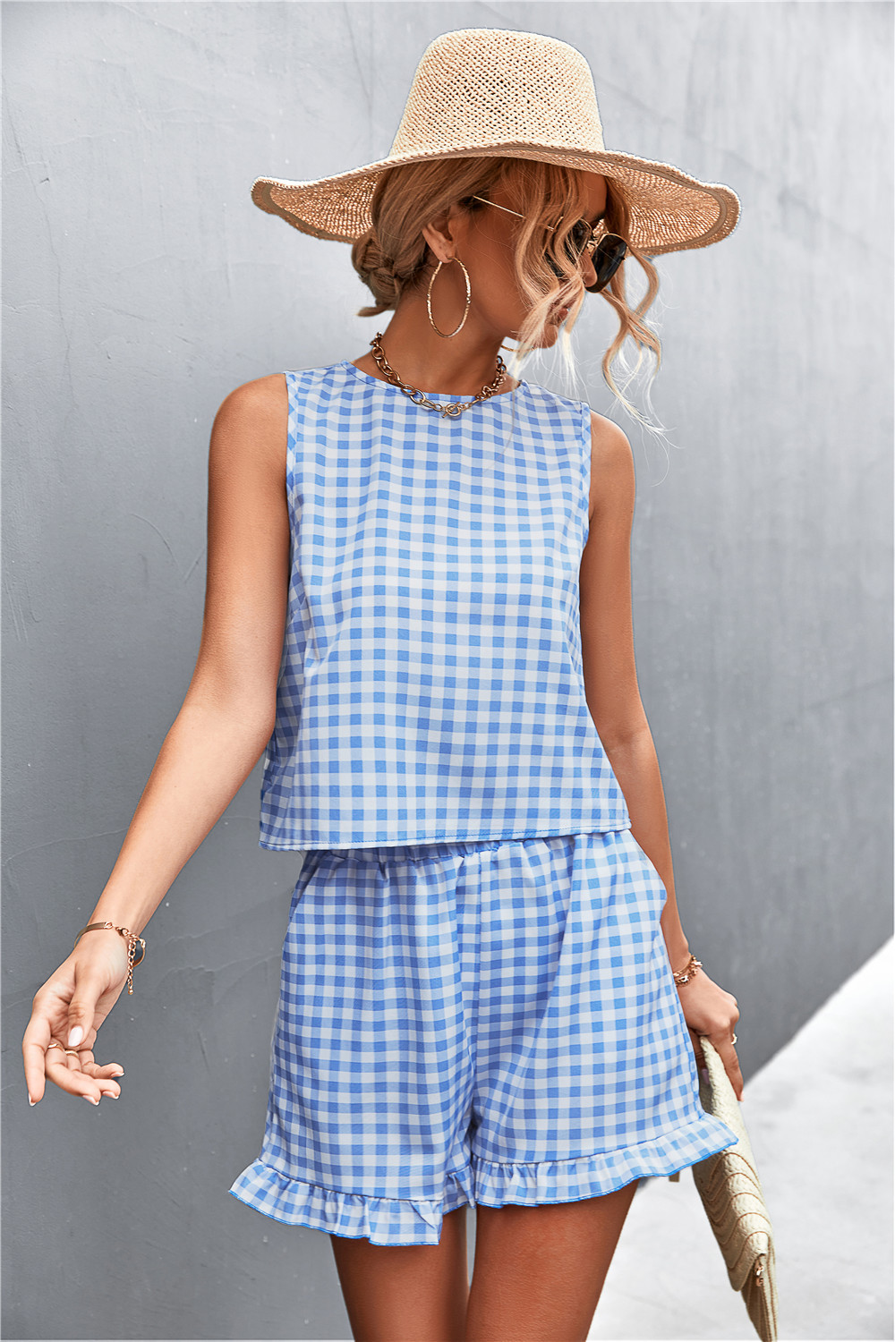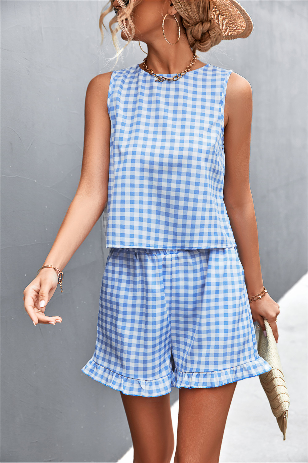New Independent Station WISH Hot Sale Black And White Plaid Casual Sleeveless Shorts Suit For Women