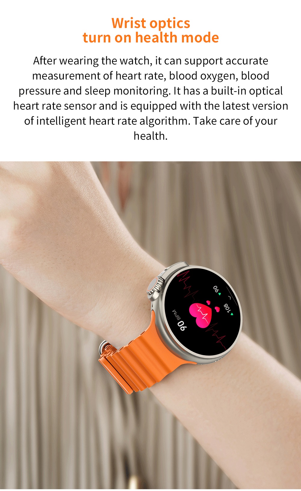 2. Health monitoring (heart rate, blood oxygen, blood pressure, sleep), data (step count, distance, calories);