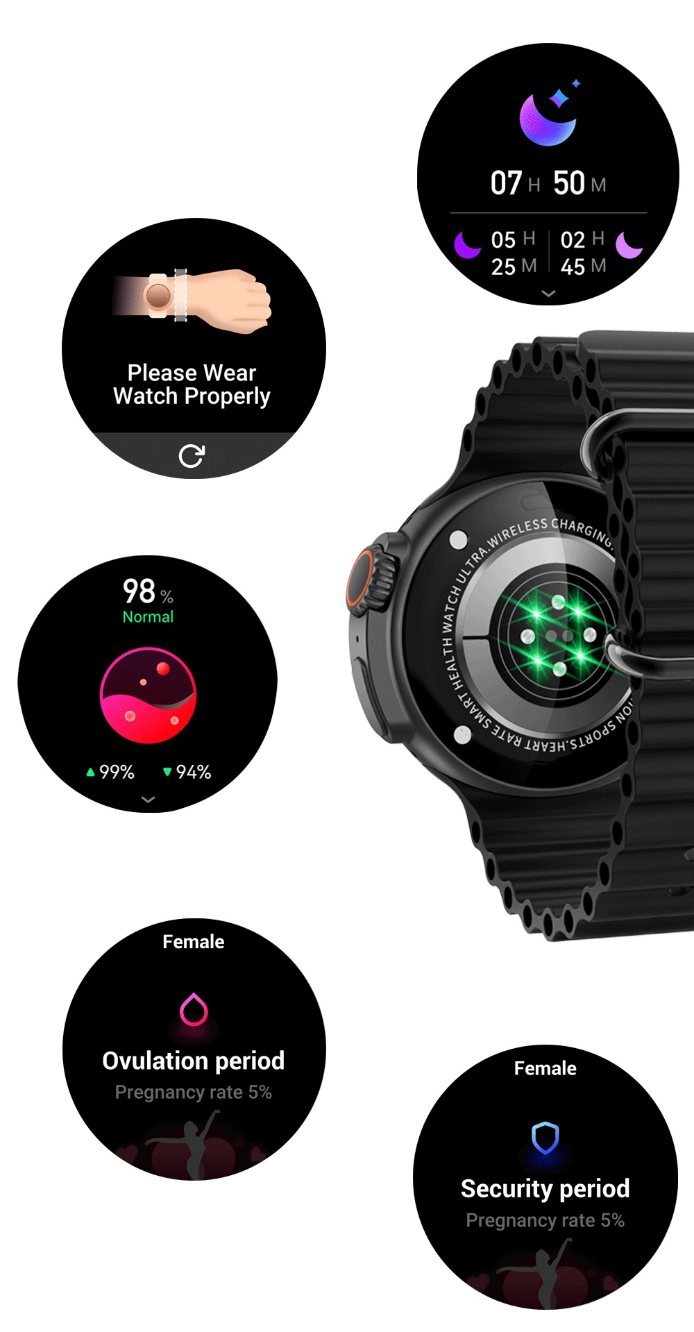 Health monitoring (heart rate, oxygen, blood pressure, sleep), data (measuring steps, distance, calories);