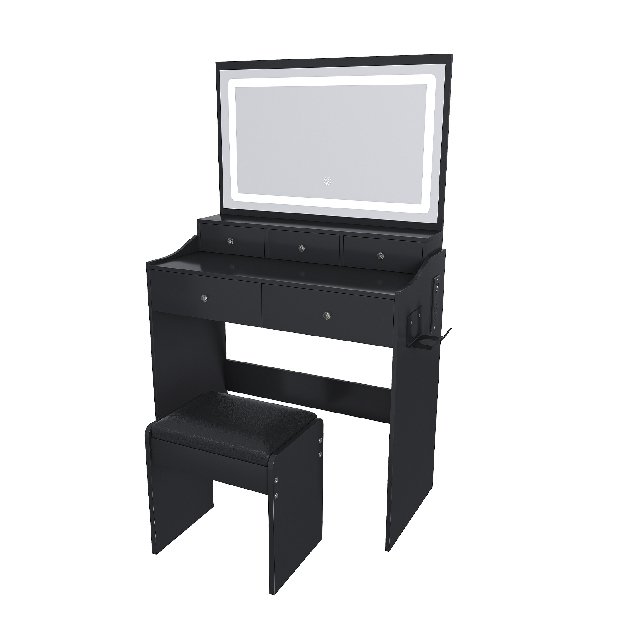 Product Name:New Large Mirror Vanity Desk for Bed room , Modern Makeup Vanity Set with Power Outlet and Hair dryer holder, 5 Drawers , 3 Lighting Color Adjustable Dressing Table for Bedroom, Black Color
