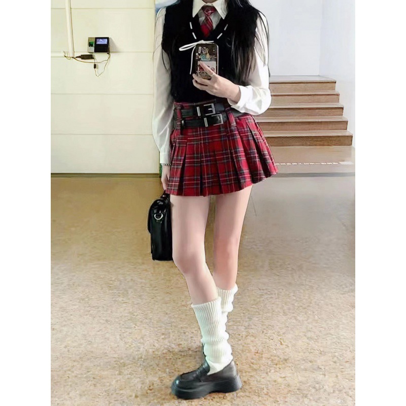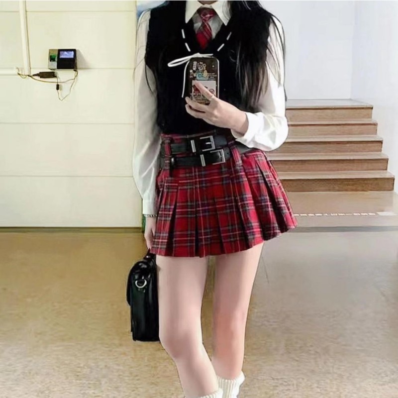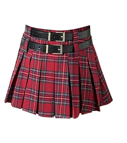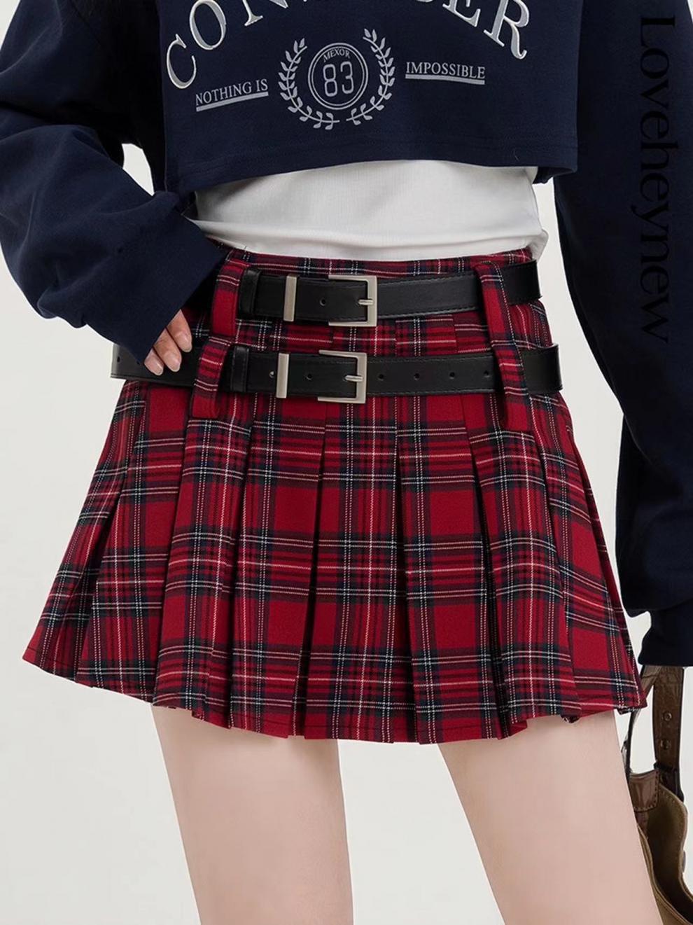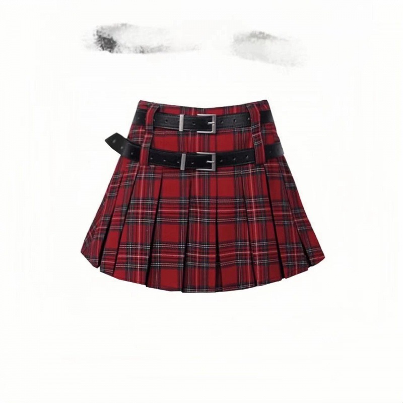 New Little Style Versatile Double Belt Short Skirt Fresh Plaid Pleated