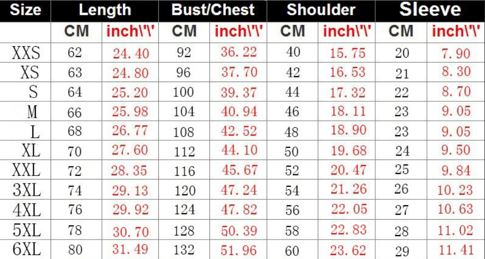 Size: XXS/XS/S/M/L/XL/XXL/3XL/4XL/5XL/6XL