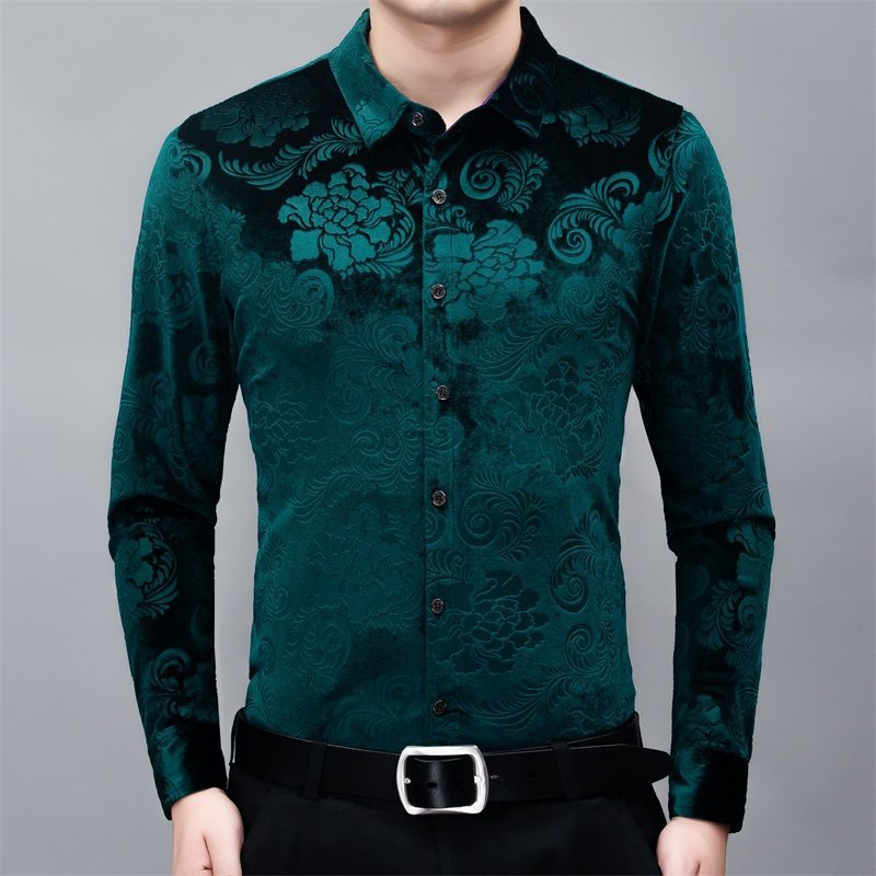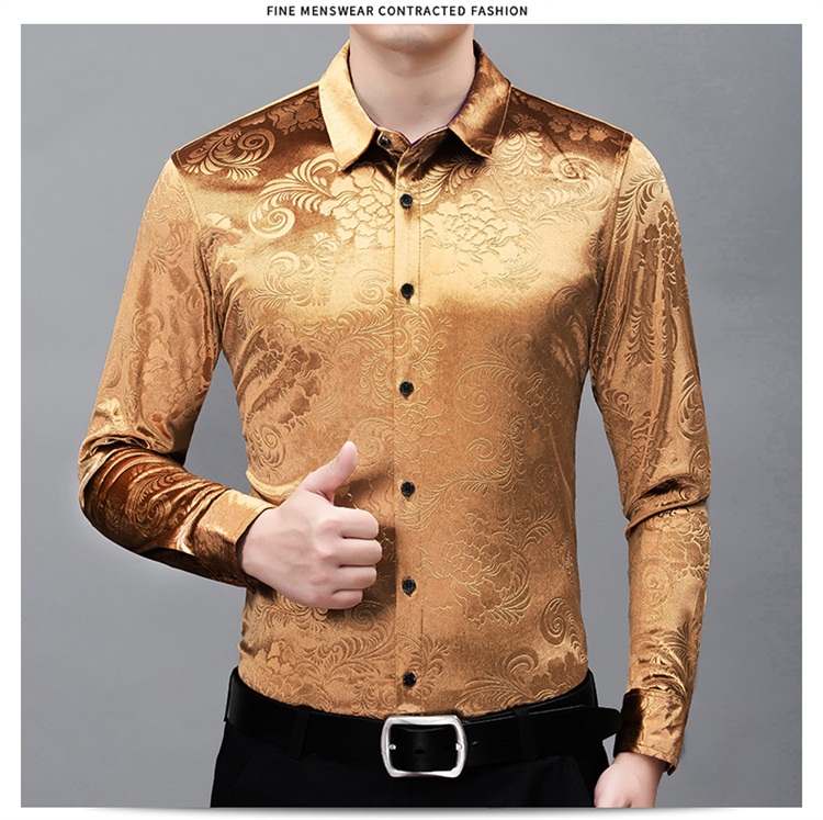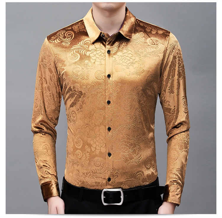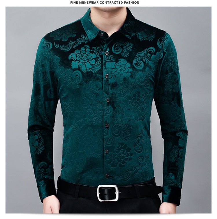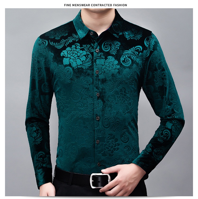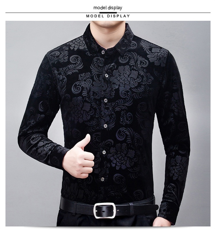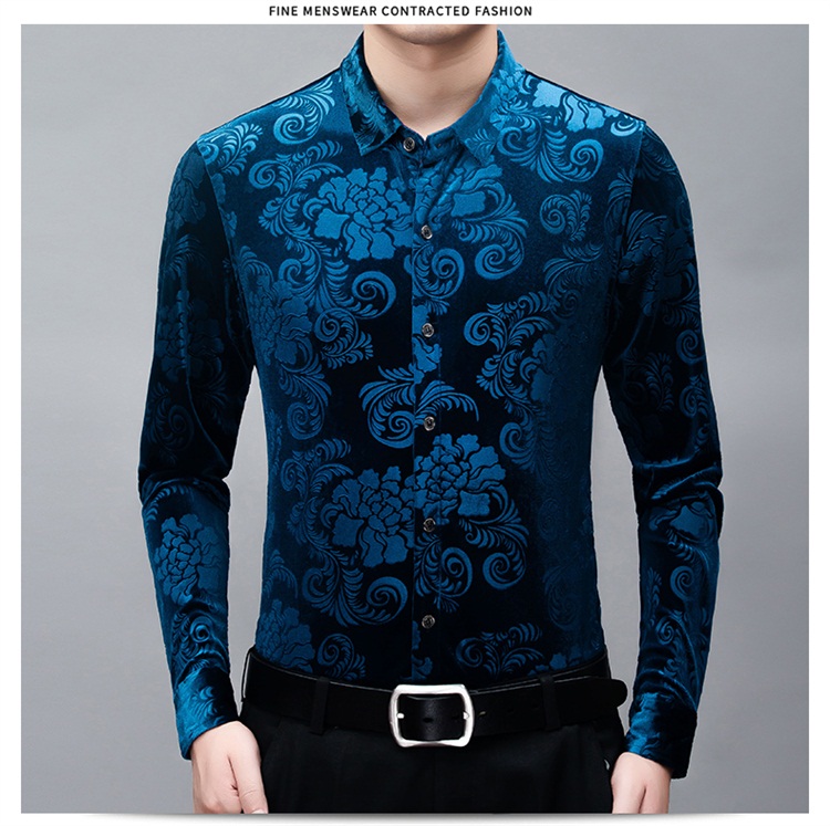 New Men's Long-sleeved Shirt Spring Men's Gold Velvet Dad Wear Loose Middle-aged Plus Size Flower Shirt Thin