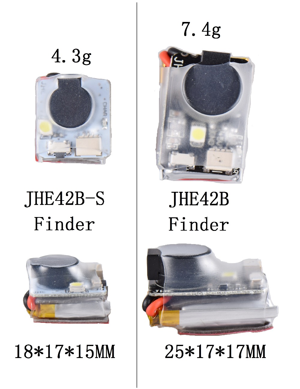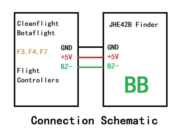 The JHE42B_S Finder is compatible with all BF and CF flight controls. Just connect to the buzzer interface of the flight controller and it will work. When the flight control wiring is correct, the multi-rotor aircraft is powered on, and the flight control power supply will automatically charge the JHE42B_S Finder (the red LED will light to indicate that charging is in progress, Red LED off means charging is saturated; red light flashing means flight controller is powered off, wait 30 seconds waiting time).