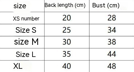 Size: XS back length 20cm (recommended 0.50kg-1.00kg,S back length 25cm (recommended 1.50kg-2.00kg,M back length 30cm (recommended 2.50kg-3.50kg,L back length 35cm (recommended 4.00kg-5.00kg,XL back length 40cm (recommended 5.50kg-8.50kg