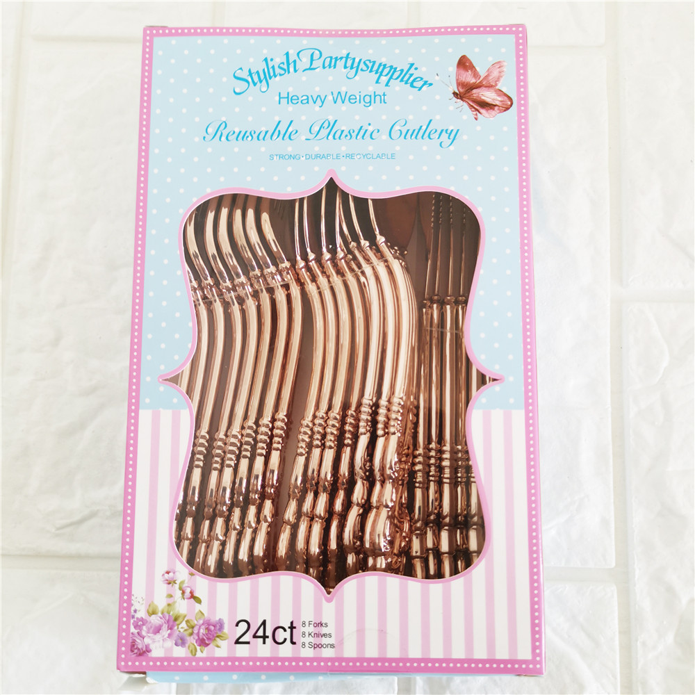 24plastic cutlery:including fork*8, spoon*8, knife*8,rose gold