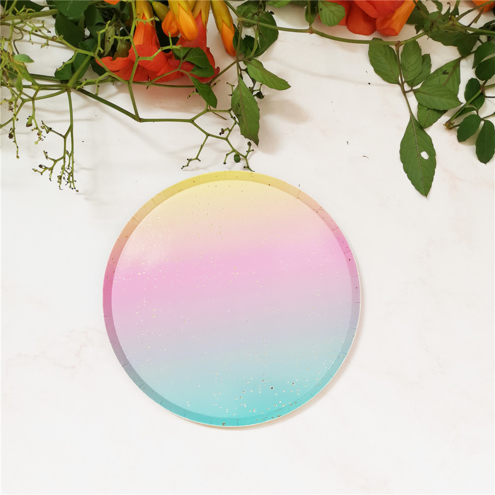 Color: 8 7-inch 18cm rainbow plates, 8 9-inch 23cm rainbow plates, 8 270ml hot stamping paper cups, 20cm plastic knife, fork and spoon each plus a paper towel, 20cm plastic knife, fork and spoon each 8 pcs boxed, 25 pcs 19.7 cm straws, four-piece set of rainbow trays, paper cups and tissues (without straws), 8 270ml paper cups and rainbow trays, 16 sheets of 25*25cm tissues