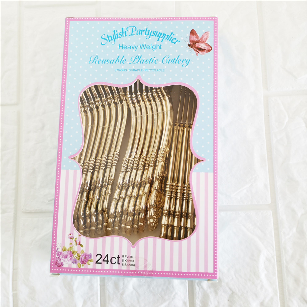 Plastic tableware: including fork*8, spoon*8, knife*8, gold
