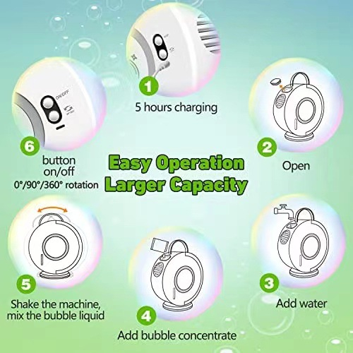 Color: round rotating bubble machine white, round rotating bubble machine Black, 20 packs bubble water (1 pack 60 ml),10 packs concentrated bubble water (50 ml to 500 ml water)