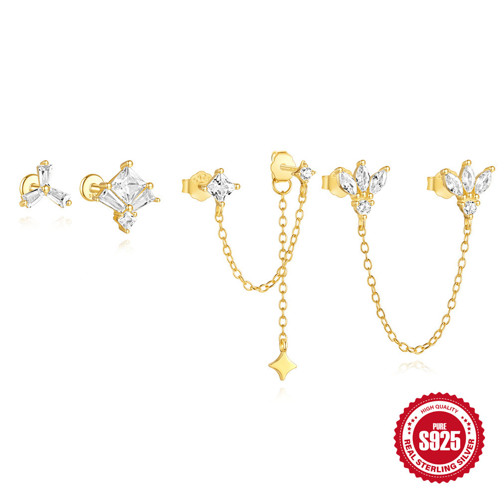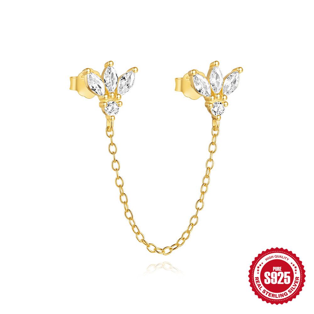 New S925 Sterling Silver Double Ear Piercings Zircon Chain Stud Earrings