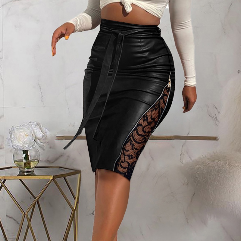 New Sexy Split Lace Stitching Slim-fit Lace Up Leather Skirt