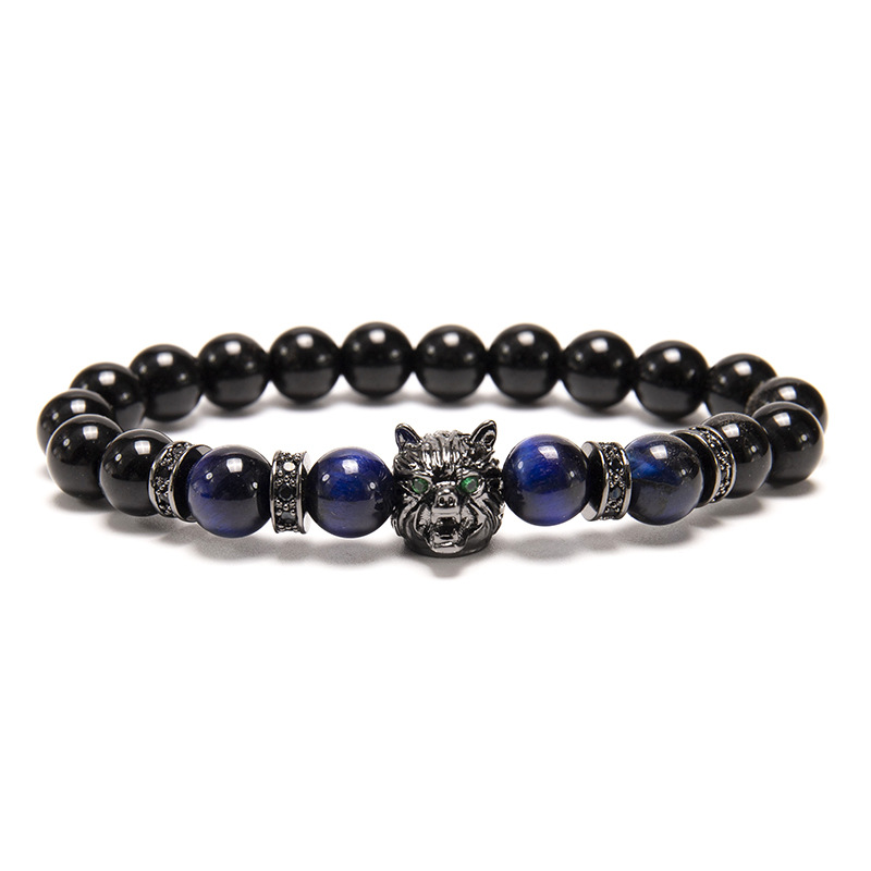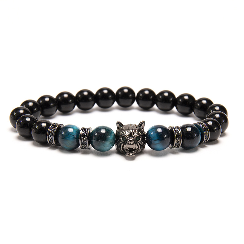 Color: 1#8mm bright black green tiger wolf head bracelet,