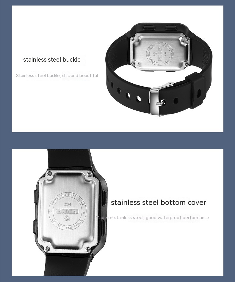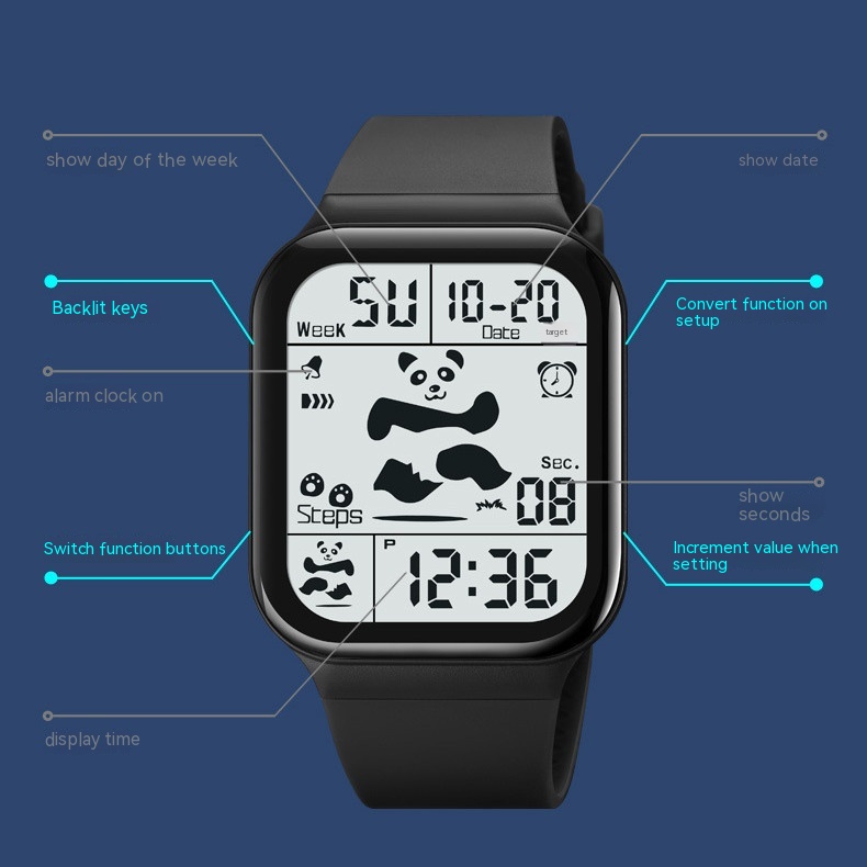 Functions: Time, stopwatch timing, LED luminous, display date, alarm clock, Display Week, hourly chiming, 12/24 hour system.