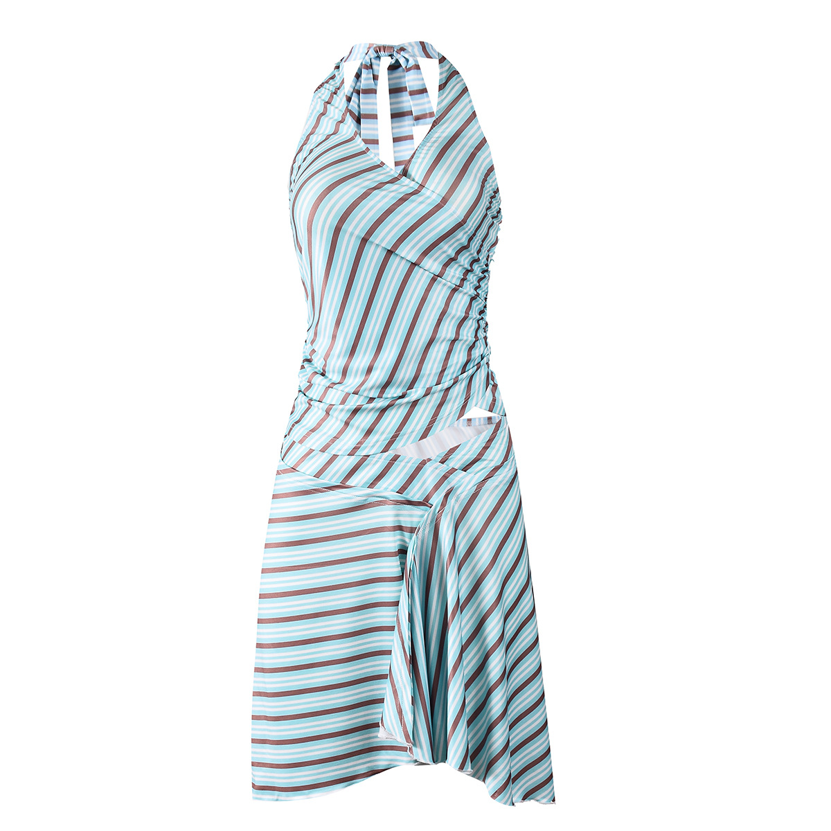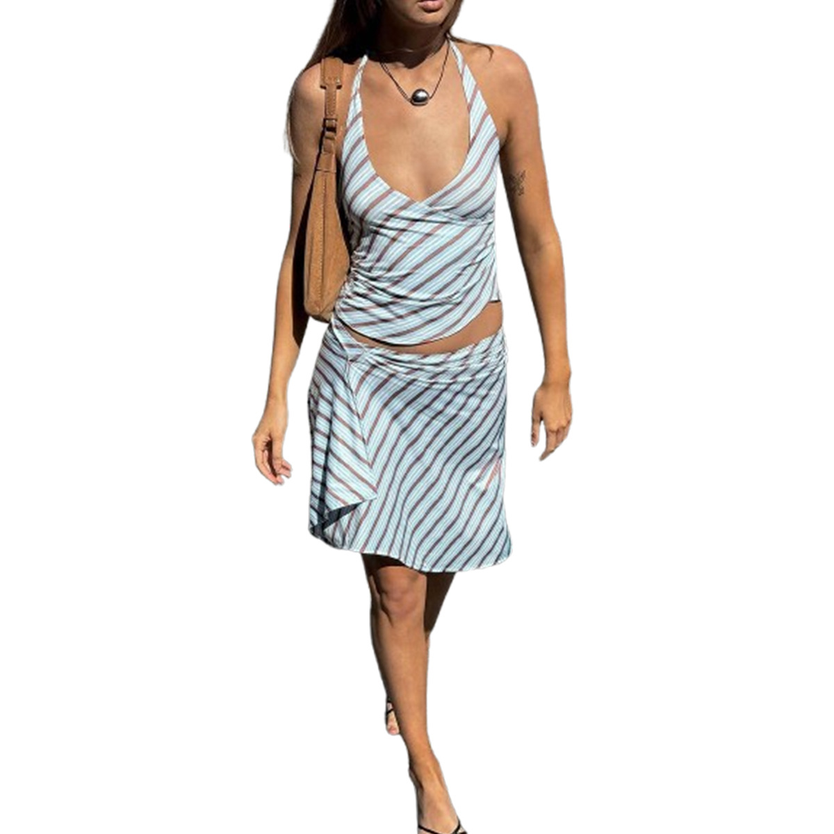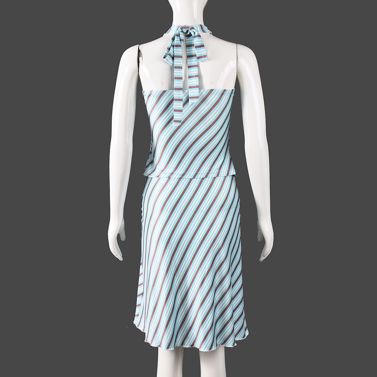 New Strappy Halter Neck Striped Dress Set With Crop Top And Open Back