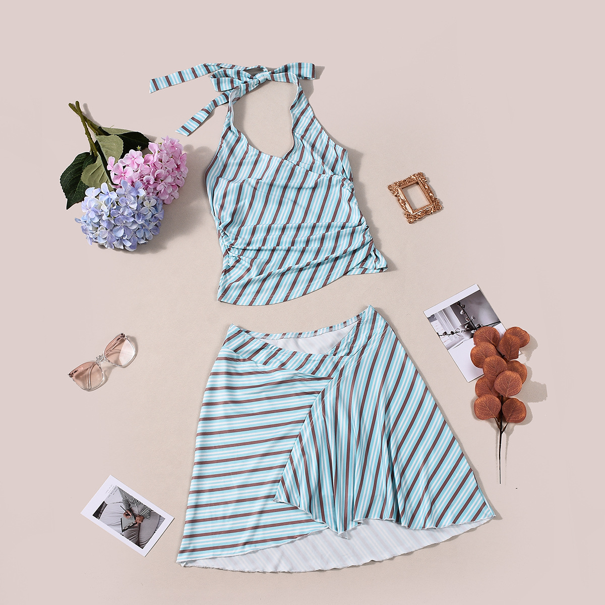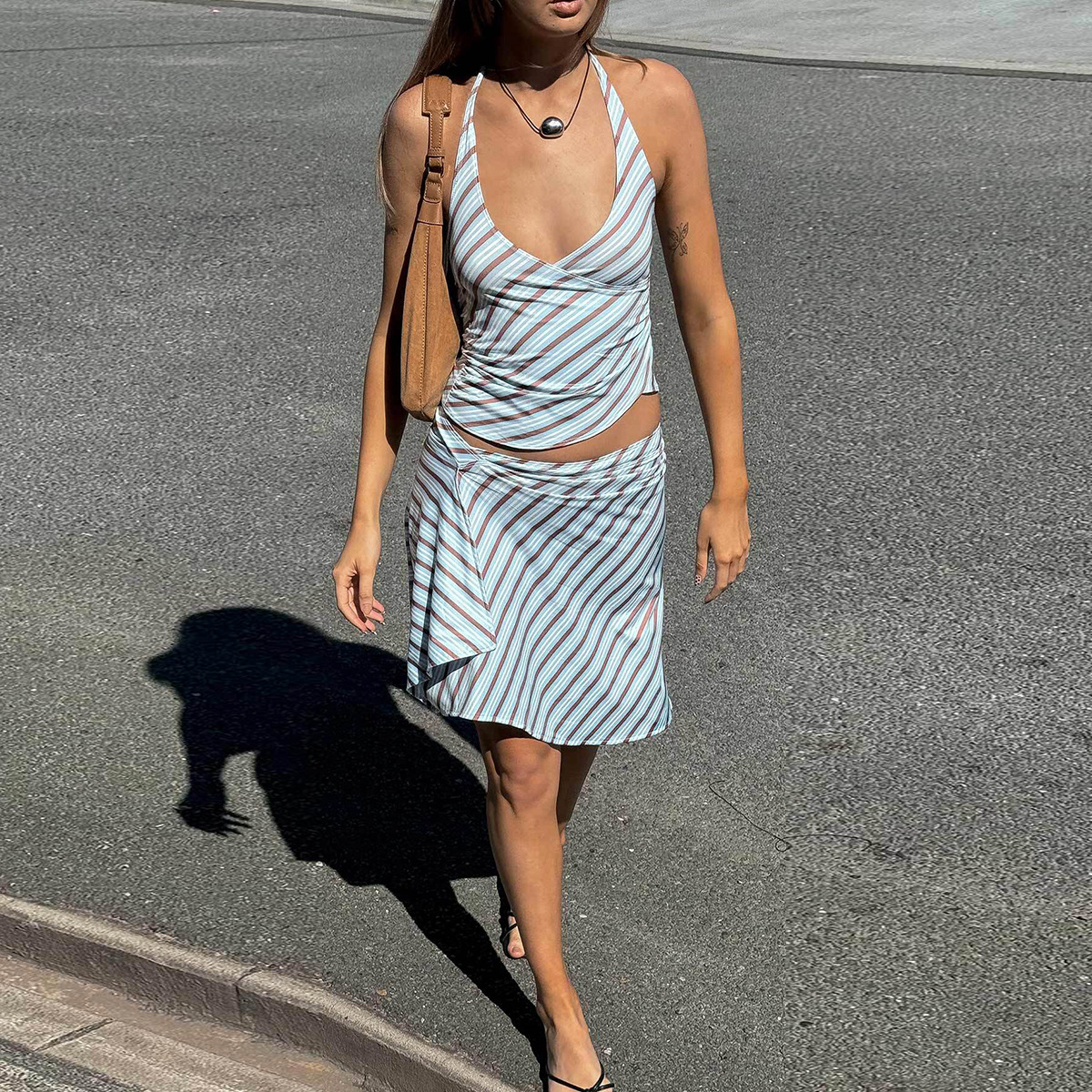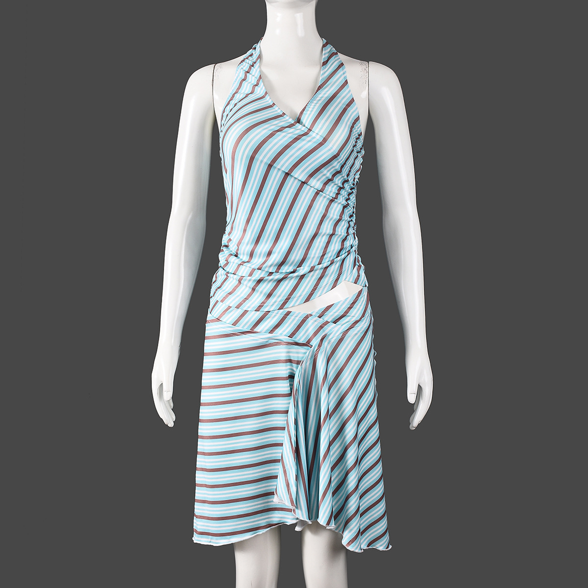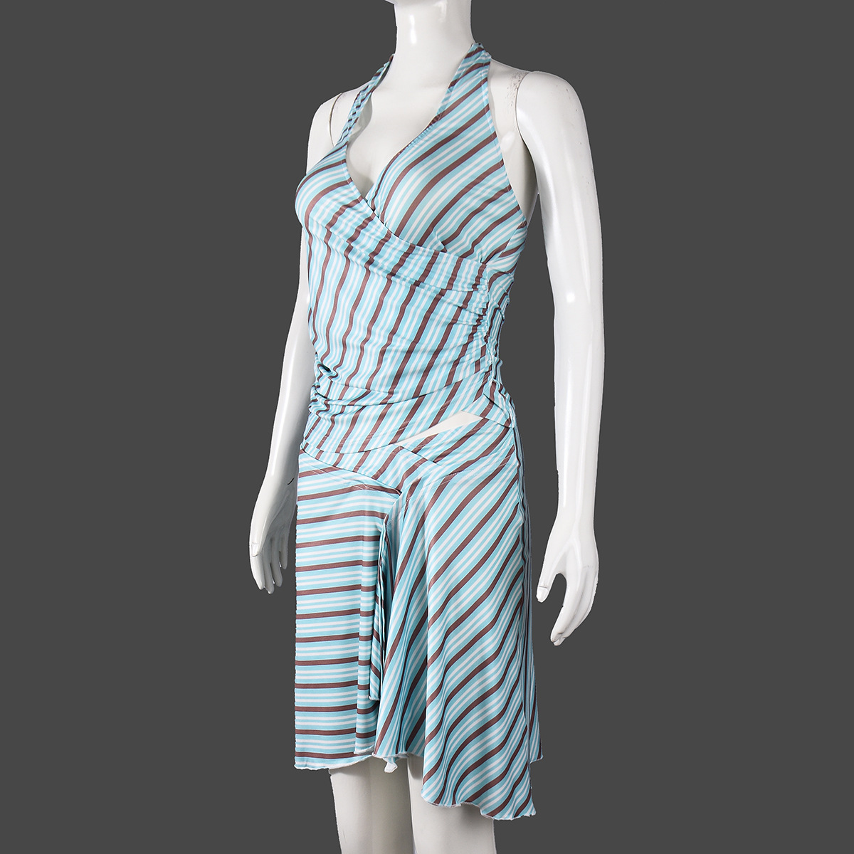 New Strappy Halter Neck Striped Dress Set With Crop Top And Open Back