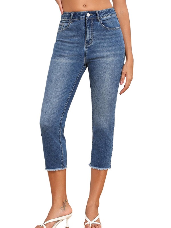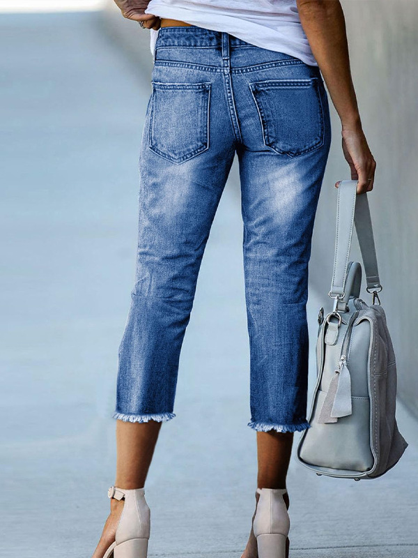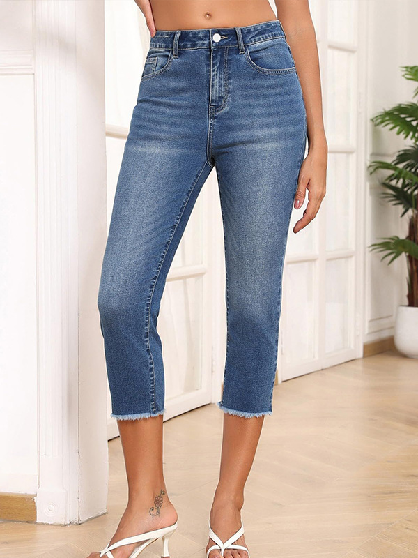 New Style Frayed Edge Slim Fit Women's Jeans Simple Versatile Capri Pants