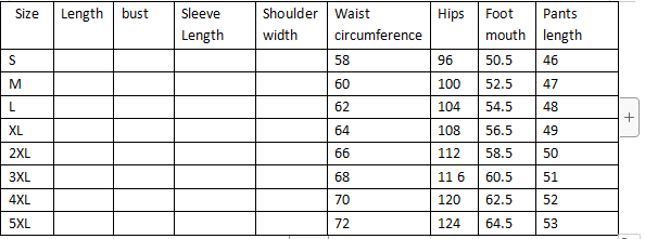 S, M, L, XL, XXL, 3XL, 4XL, 5XL