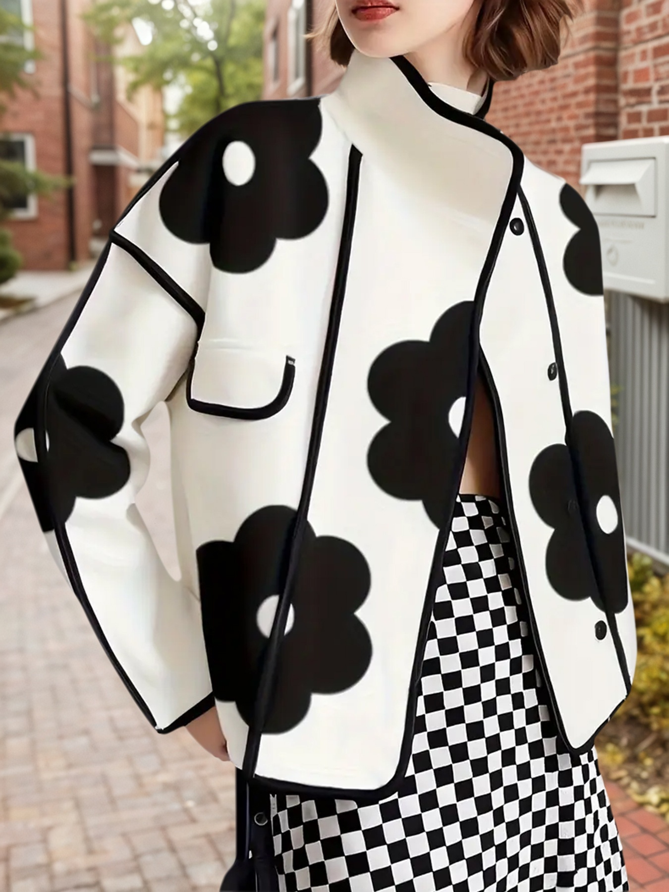 New Style Women's Long-sleeved Loose Contrast-colored Flower-printed Slit Stand-collar Jacket Wool Jacket