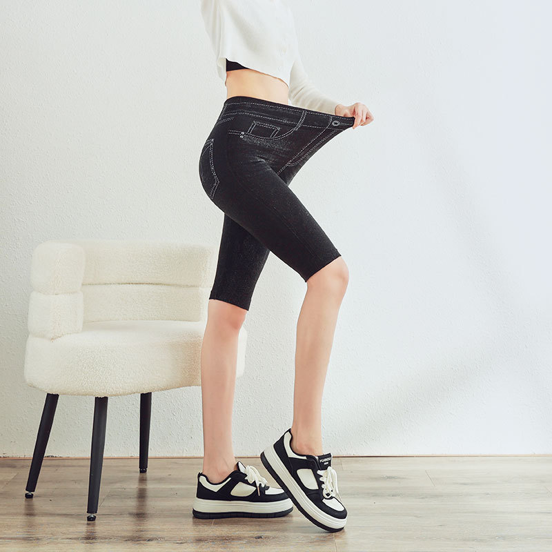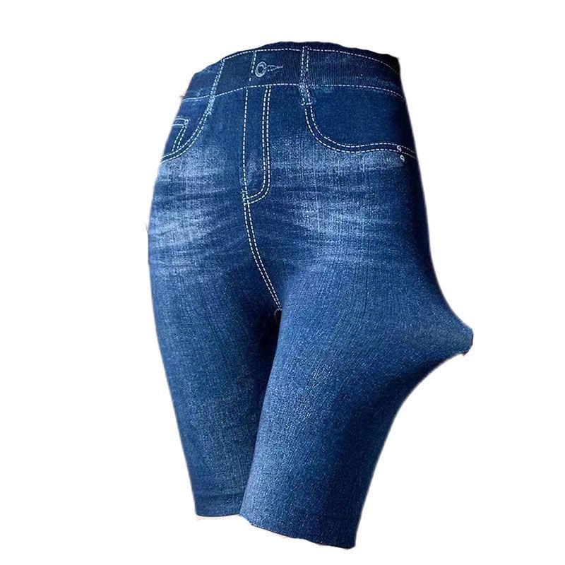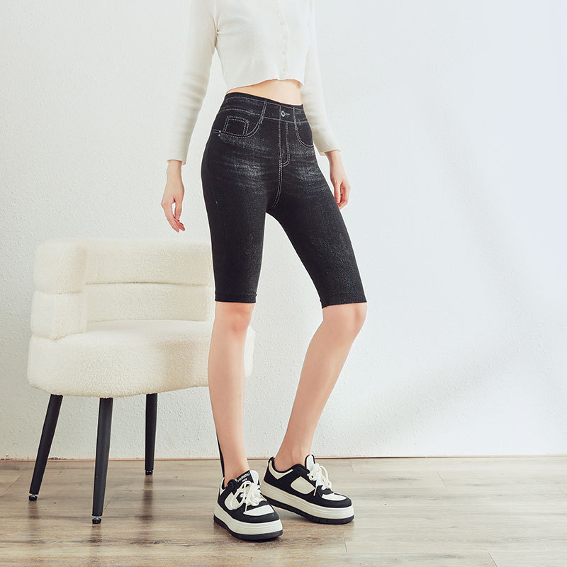 Colors: Black cropped printed jeans, blue cropped printed jeans