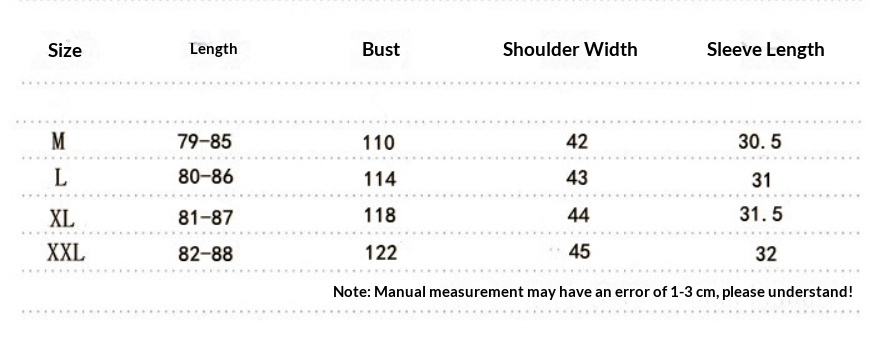 1. Asian sizes are 1 to 2 sizes smaller than European and American people. Choose the larger size if your size between two sizes. Please allow 2-3cm differences due to manual measurement. 2. Please check the size chart carefully before you buy the item, if you don't know how to choose size, please contact our customer service. 3.As you know, the different computers display colors differently, the color of the actual item may vary slightly from the following images.