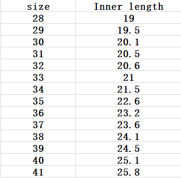 Size: 26 yards/insole length 16.6cm, 27 yards/insole length 17.2cm, 28 yards/insole length 17.8cm, 29 yards/insole length 18.5cm, 30 yards/insole length 19cm, 31 yards/insole length 19.7cm, 32 Size/Insole Length 20.4cm, Size 33/Insole Length 21cm, Size 34/Insole Length 21.6cm, Size 35/Insole Length 22.3cm, Size 36/Insole Length 23cm, Size 37/Insole Length 23.7cm, Size 38/Insole Length 24.5cm, size 39/insole length 25.2cm, size 40/insole length 25.8cm, size 41/insole length 26.4cm, size 42/insole length 27cm