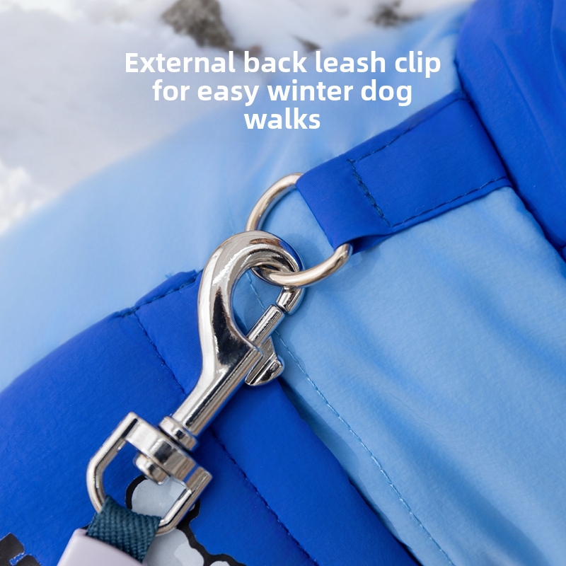Keep your furry friend warm and stylish this winter with the Padded Dog Snowsuit! This full-body jumpsuit features a cozy padded design, a hood for extra protection, and a cute pocket with a "Hello!" bear print. Made with durable, insulated fabric, it ensures your pet stays warm in cold temperatures. The built-in metal leash ring adds convenience for walks, while the vibrant blue color and adorable details make your pet stand out. Perfect for small dogs, this snowsuit combines functionality, comfort, and charm for all your winter adventures.