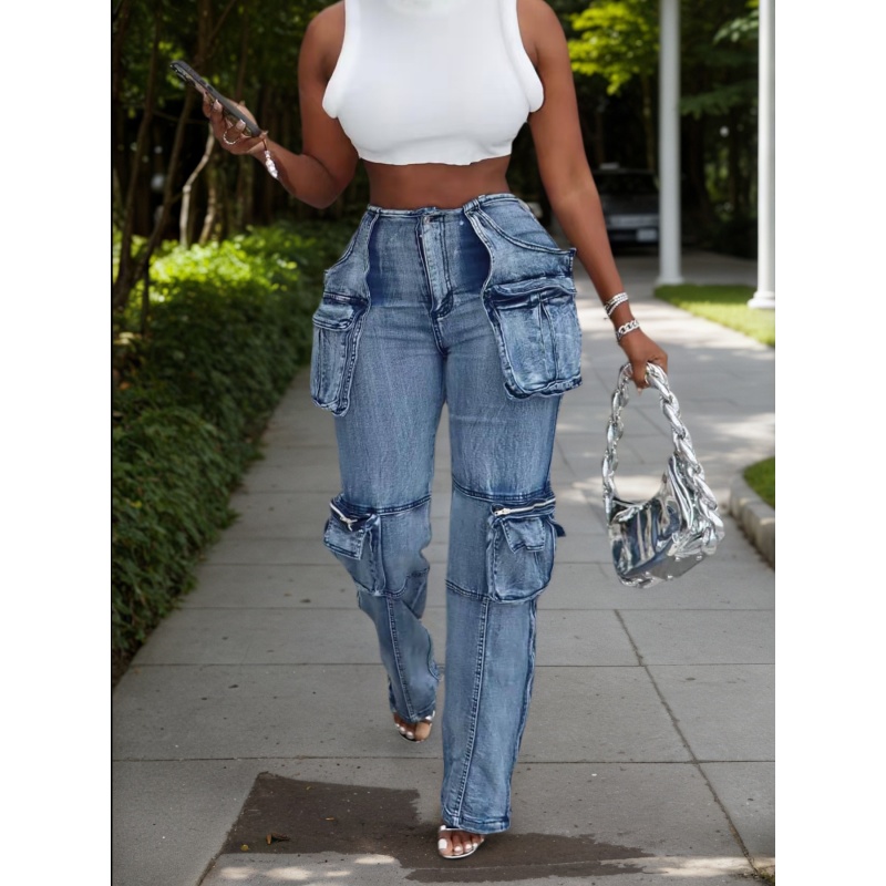 New Women's Casual And Versatile Multi-pocket Work Pants, Mid-waisted Washed Straight-cut Jeans