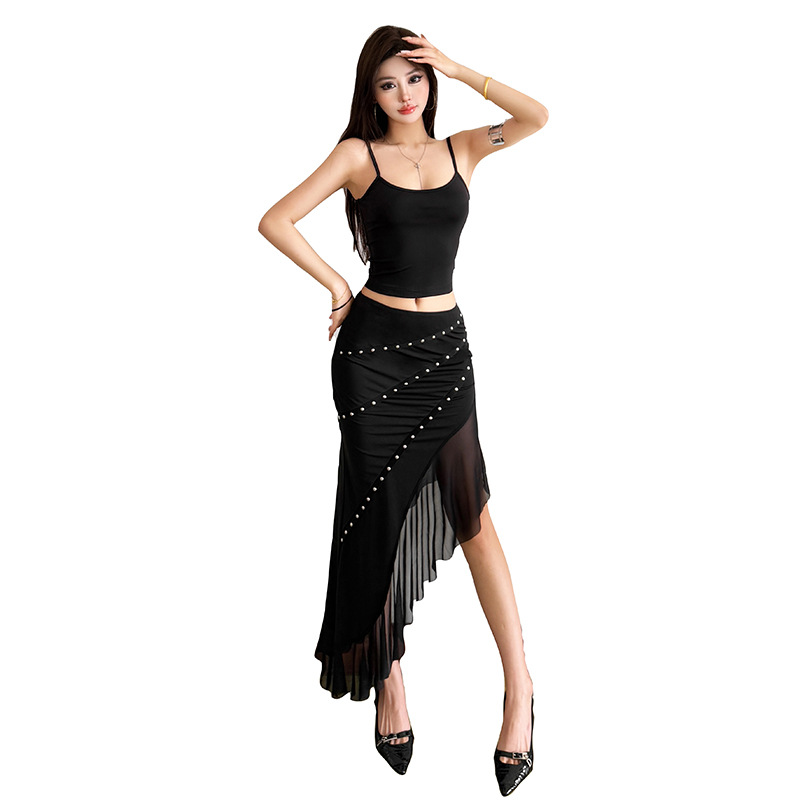 New Womens Outfit Figure-flattering Spaghetti-strap Tank Top Paired With A Mesh-panel Studded Skirt
