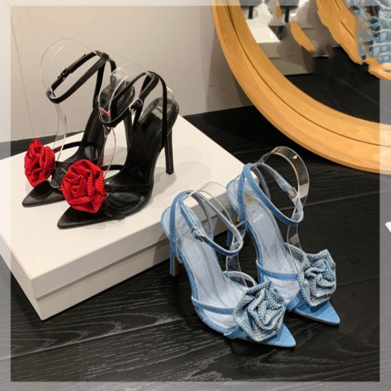 New Women's Shoes Pointed Toe Rhinestone Flower Strap Stiletto Heel Sandals