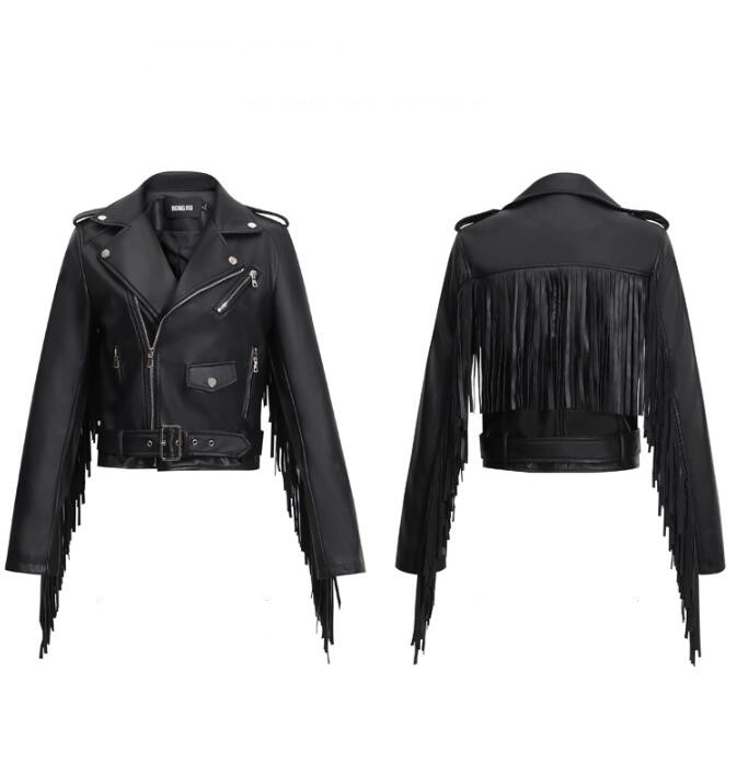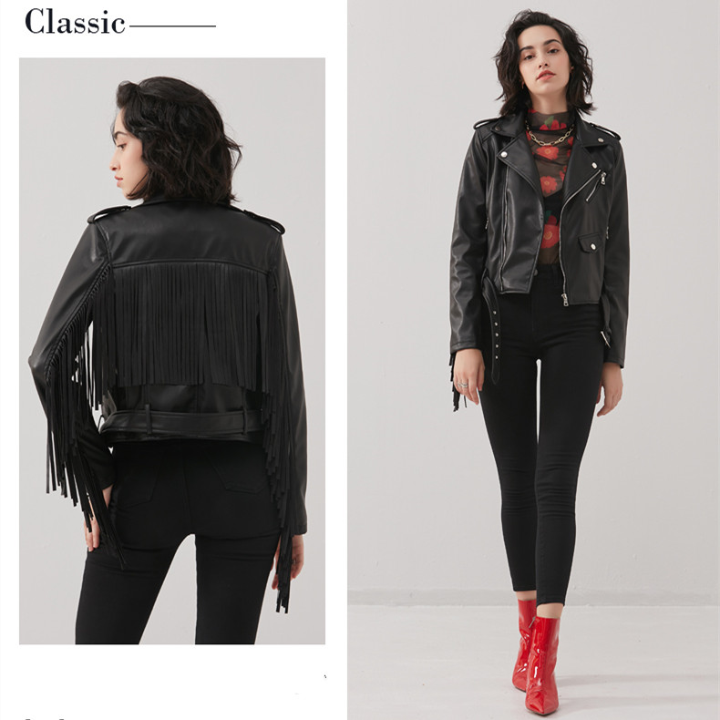 New Women's Tassel Short Slim Leather Jacket Motorcycle