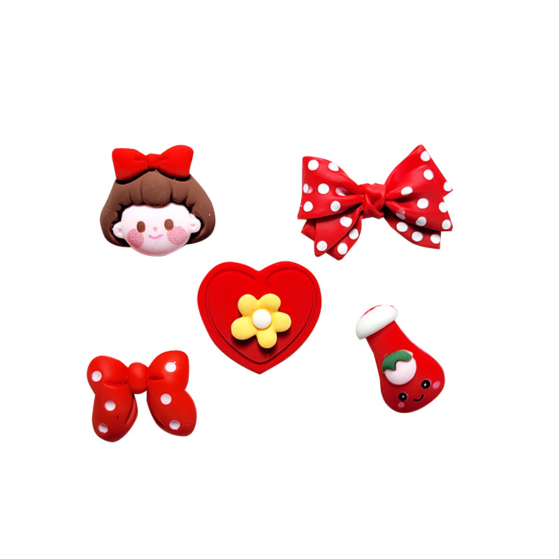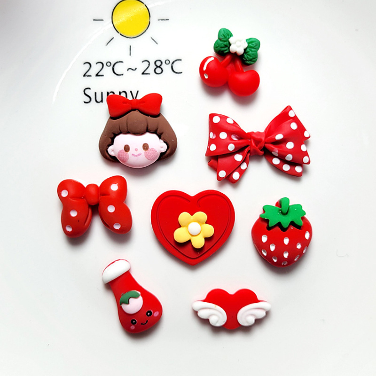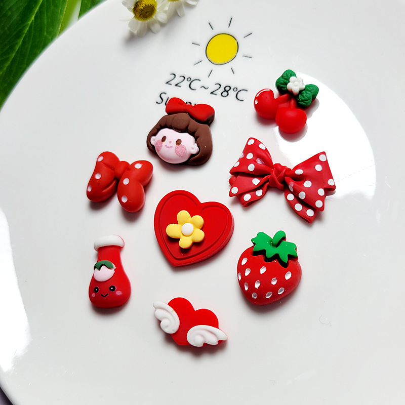 Color: red girl head, red polka dot bow, red cherry, red milk bottle, Red Wings love heart, red strawberry, red bow tie, red love heart