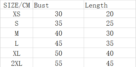 Size: XS (bust 30, back length 20cm), S (bust 35, back length 25cm), M (bust 40, back length 30cm), L (bust 45, back length 35cm), XL (bust 50, back length 40cm), 2XL (chest circumference) 55 back length 45cm)