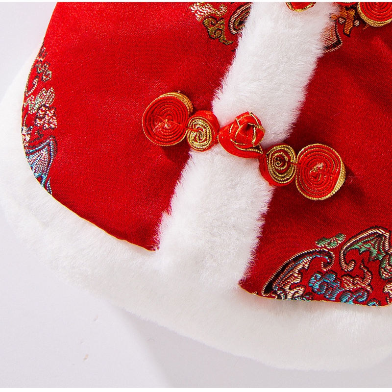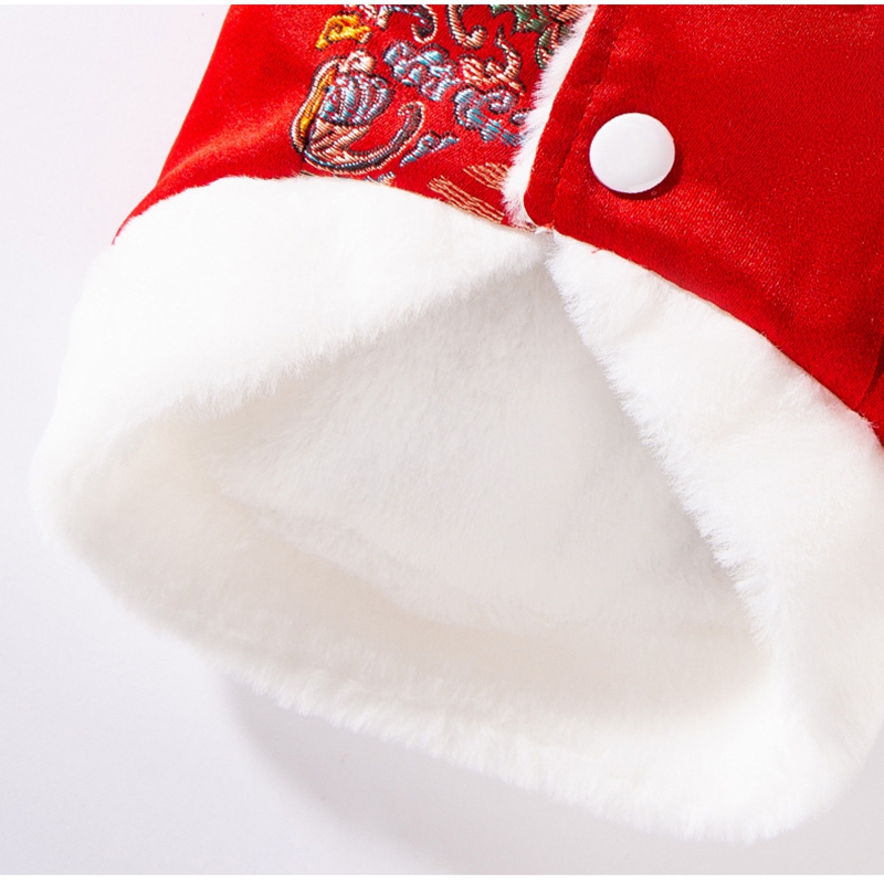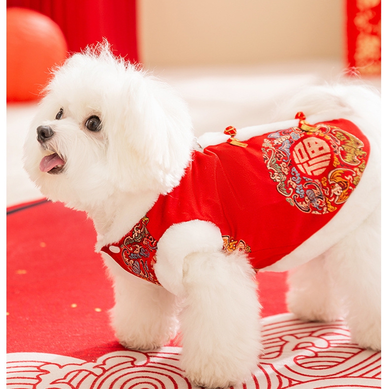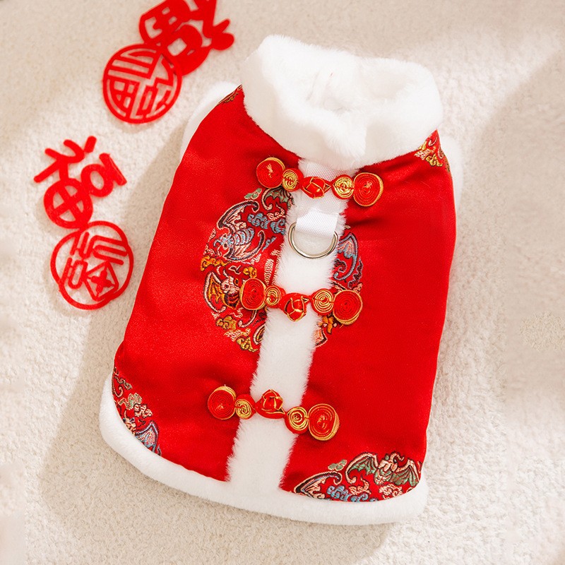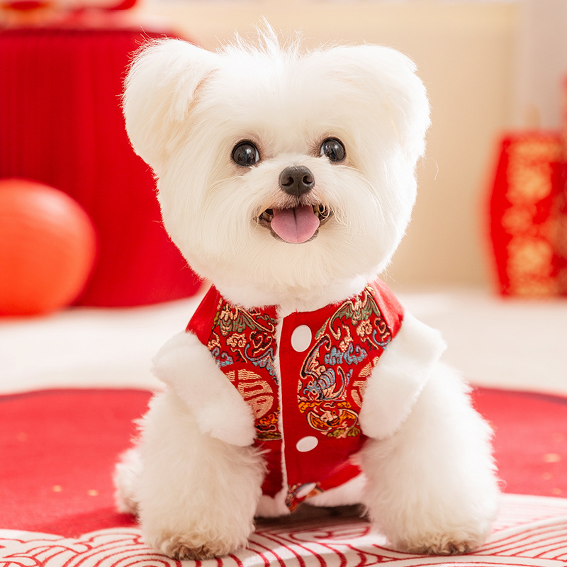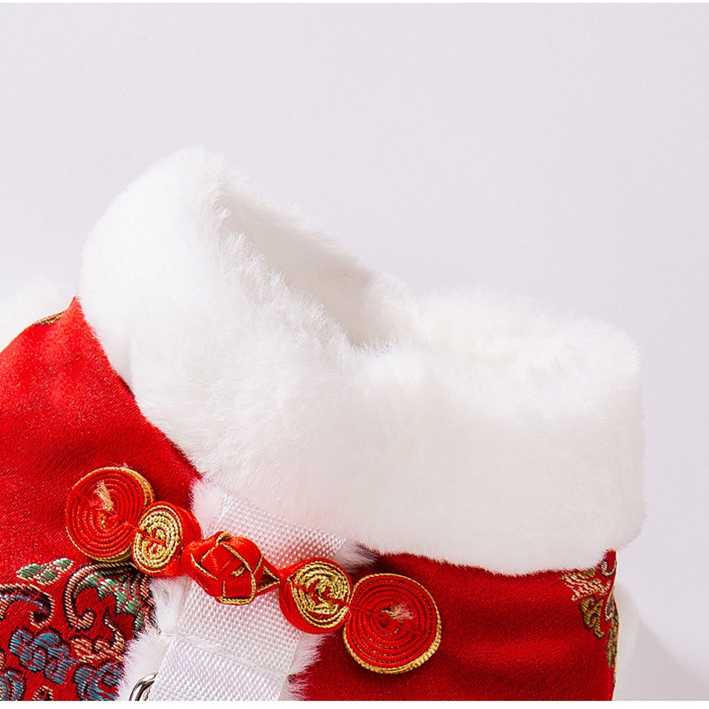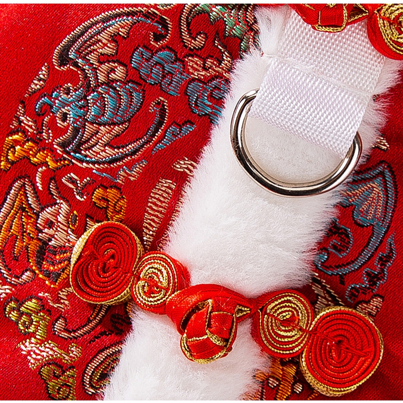 Celebrate Lunar New Year in opulent style with this Red Brocade Pet Vest! Featuring intricate traditional Chinese embroidery, vibrant red hues, plush faux fur trim, and an integrated leash ring, this vest embodies prosperity and cultural heritage. The ornate knot buttons and detailed patterns add a touch of luxury, making it perfect for Lunar New Year gatherings. Ideal for pet parents wanting to share the holiday spirit, this vest combines traditional craftsmanship, festive charm, and functional design, ensuring your furry companion stands out with Lunar New Year elegance.