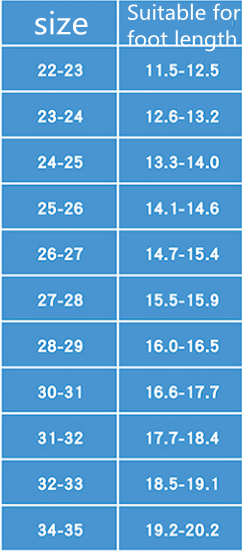 Size: 22-23 yards inner length 13.3CM, 24-25 yards inner length 14.7CM, 26-27 yards inner length 15.5CM, 28-29 yards inner length 16.5CM, 30-31 yards inner length 17.3CM, 32-33 The length of the code is 19CM, the length of the code 34-35 is 19.7CM