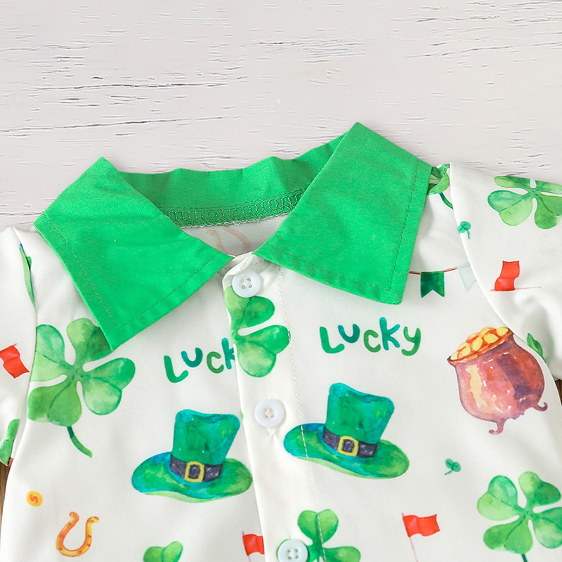 Celebrate the luck of the Irish with this festive clover-print romper and suspender pants set! Designed for holiday photos and comfy wear, this breathable outfit keeps your little boy looking stylish and cozy all day long.