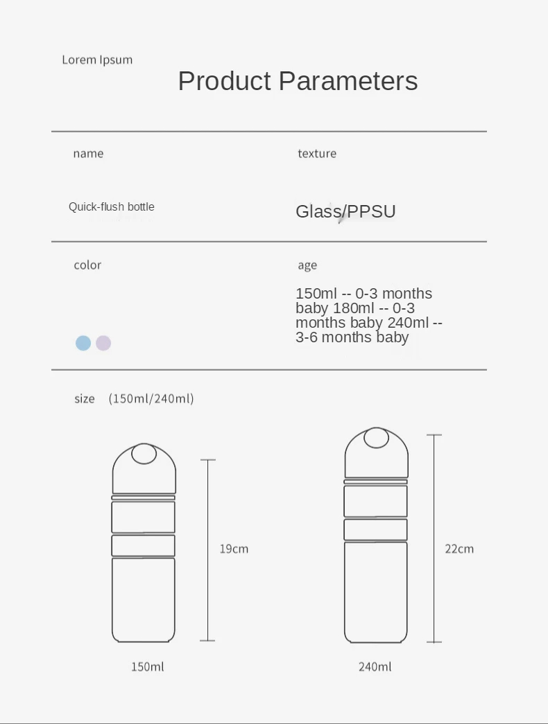 Capacity: glass pink 150ml, glass pink 240ml, glass blue 150ml, glass blue 240ml, PPSU pink 180ml, PPSU pink 240ml, PPSU blue 180ml, PPSU blue 240ml